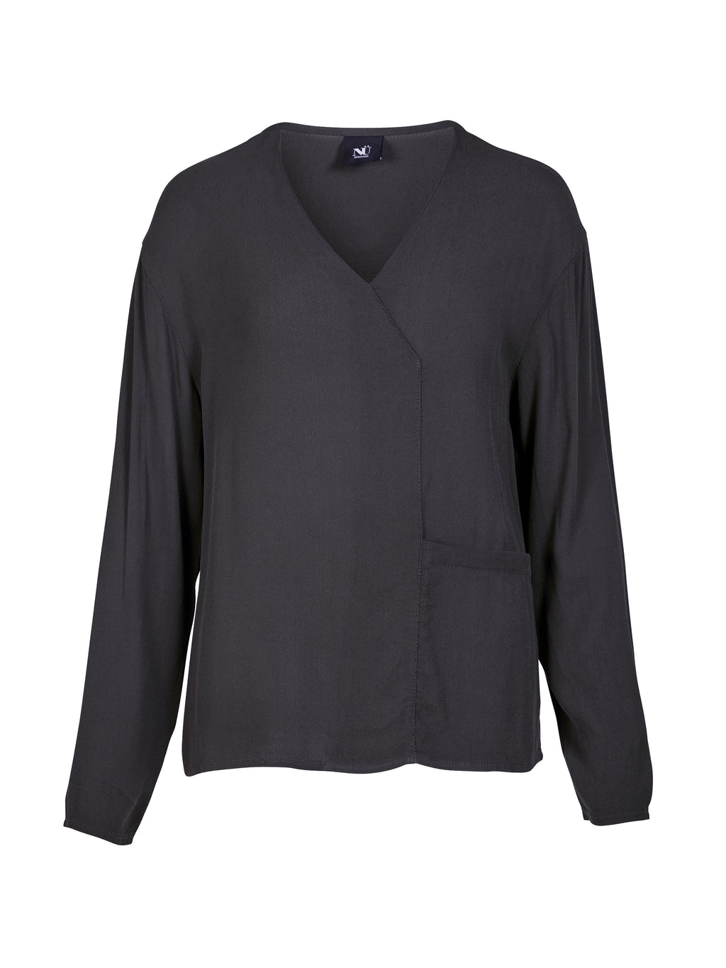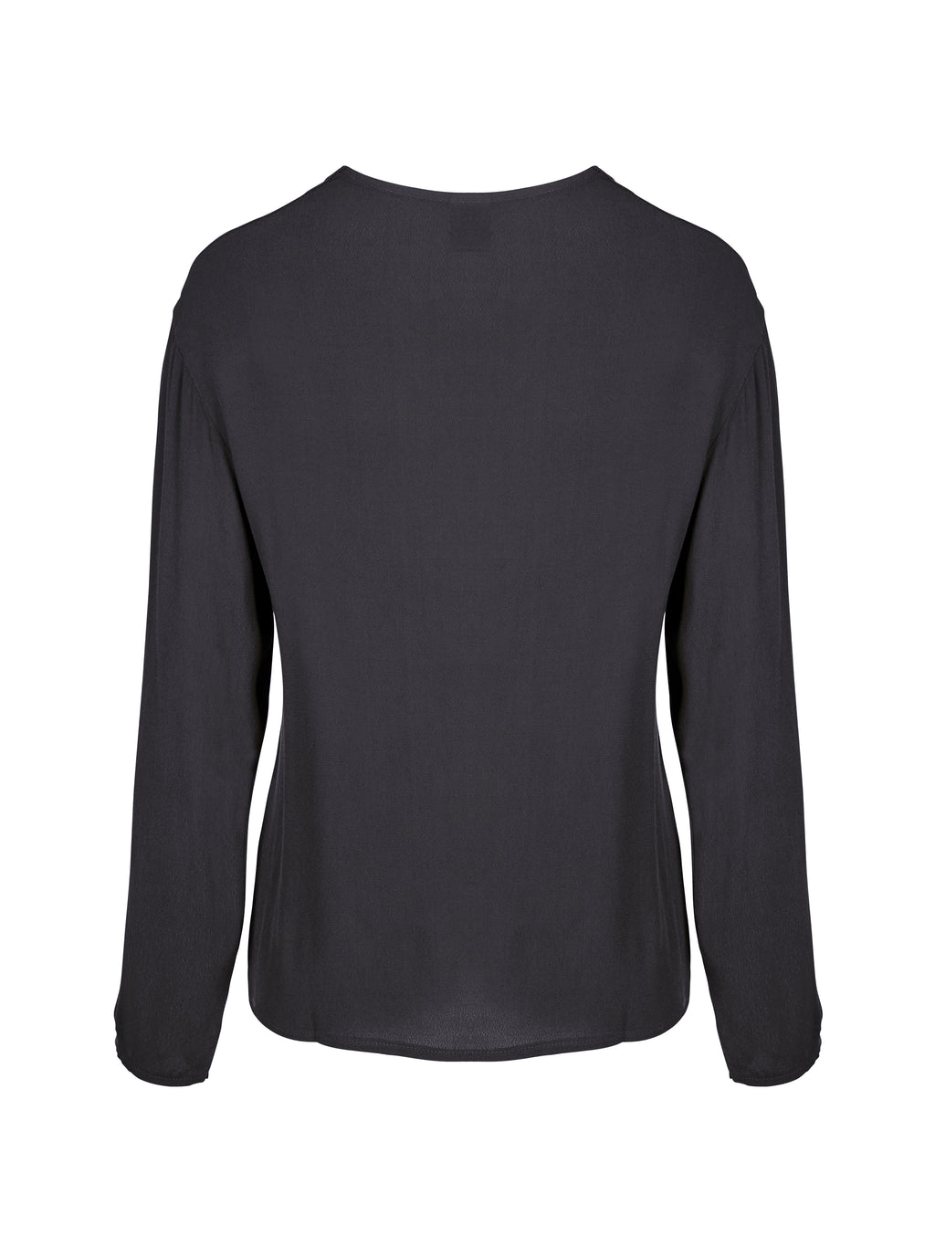 Deze blouse heeft een relaxte en moderne snit met een V-hals en lange mouwen. De lichte en zachte kwaliteit maakt het comfortabel om te dragen, terwijl het decoratieve voorpaneel de blouse een grafische en strakke uitstraling geeft. De asymmetrische voorste naad creëert een interessant detail en voegt diepte toe aan het eenvoudige ontwerp.