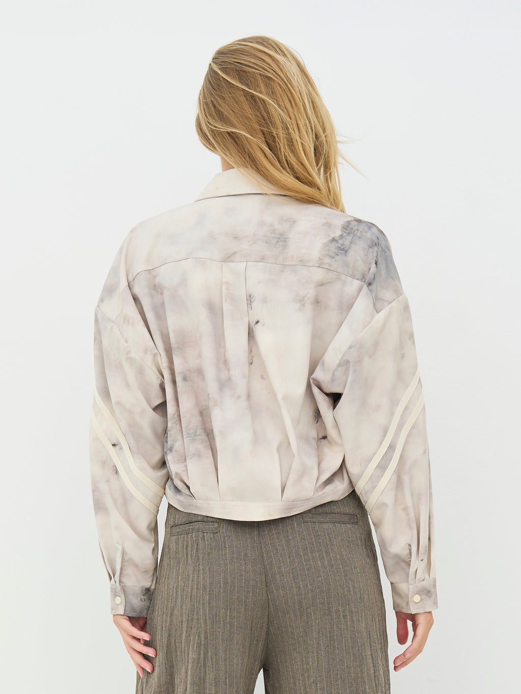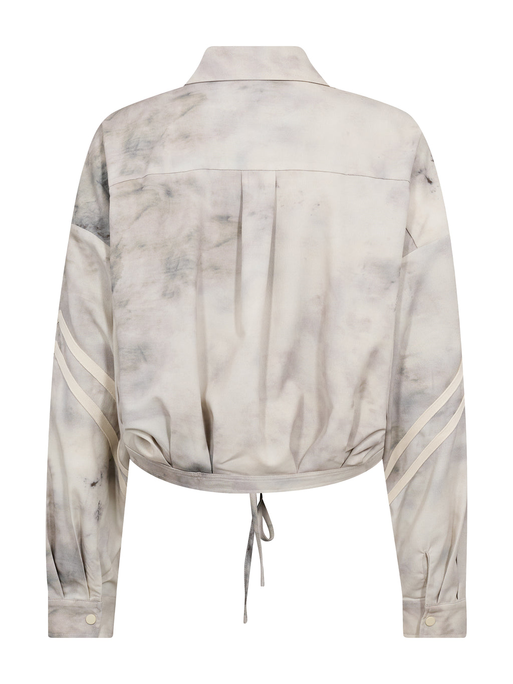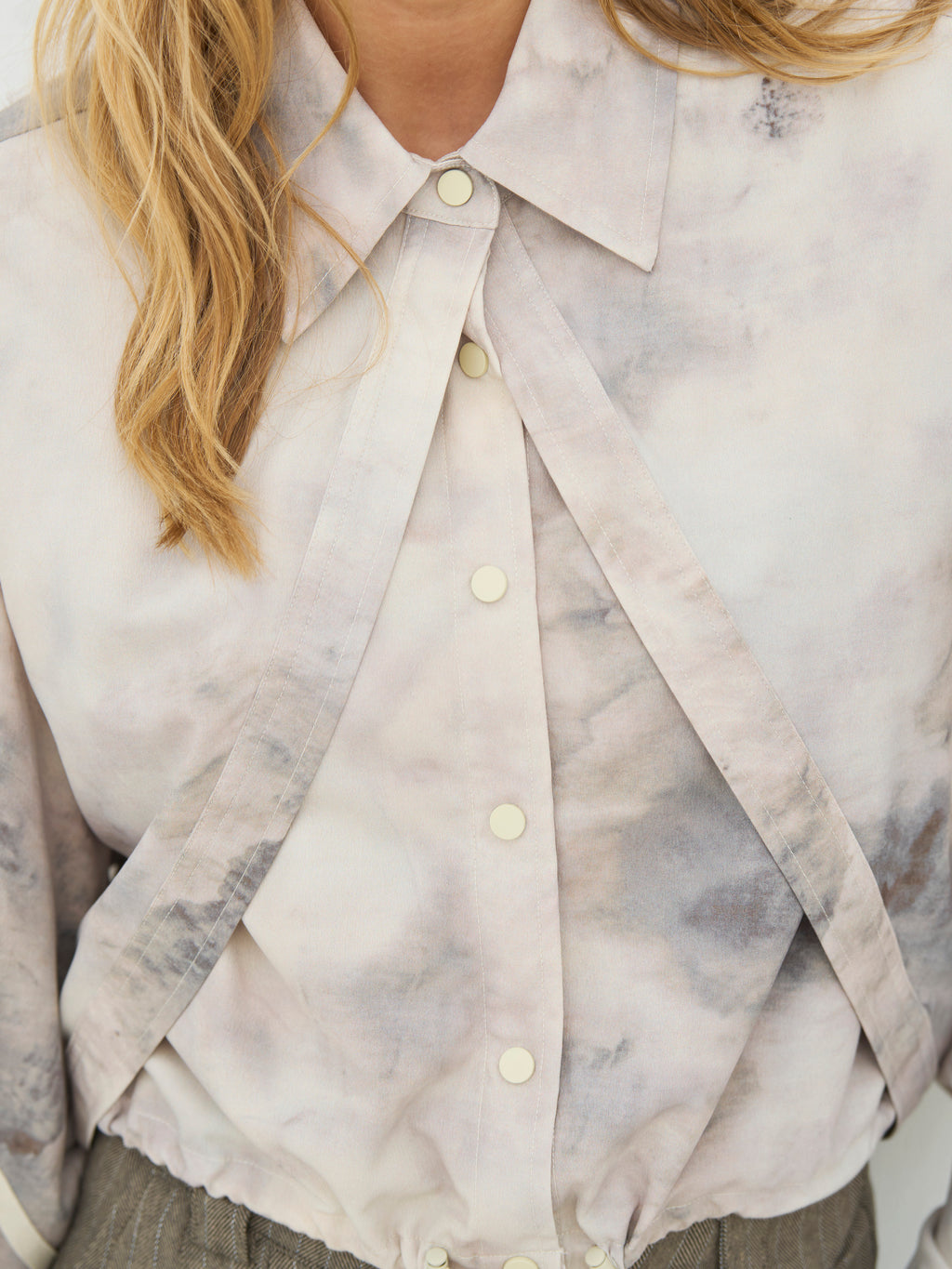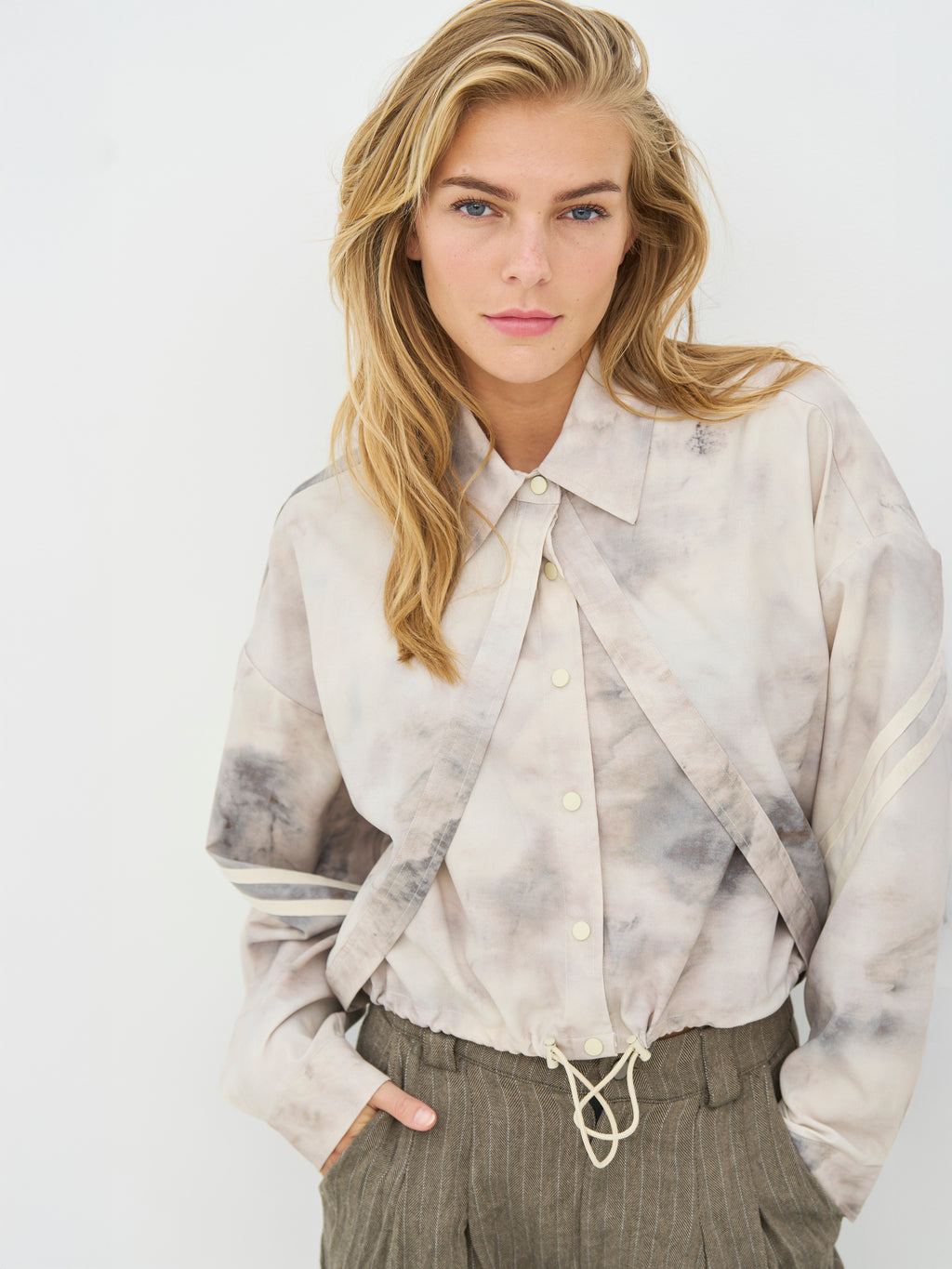 Dit shirt heeft een ontspannen en licht stoere uitstraling dankzij het licht gemarmerde patroon en de korte lengte. De klassieke kraag en knoopsluiting aan de voorkant zorgen voor een herkenbare look, terwijl de opvallende naden en lijnen op de voorkant en mouwen structuur en karakter toevoegen. Het koord in de zoom maakt het mogelijk de pasvorm aan te passen en geeft het shirt een meer ontspannen vorm. De achterkant is eenvoudig gehouden en valt licht over de rug. Draag het met de bijpassende broek voor een complete set, of combineer het met een effen broek om de details van het jasje nog meer te benadrukken.