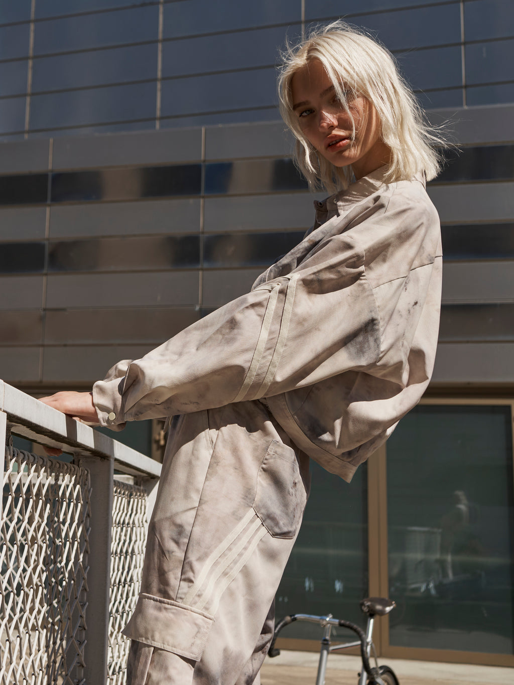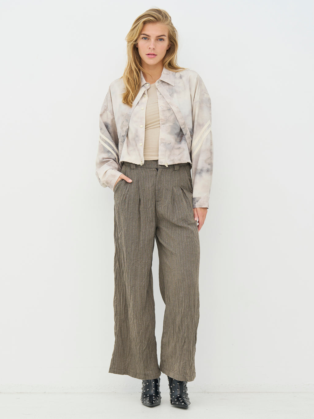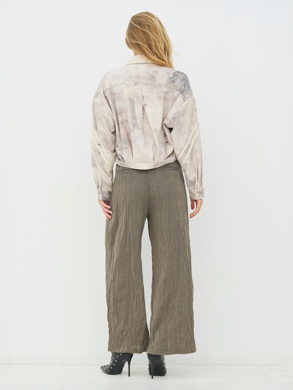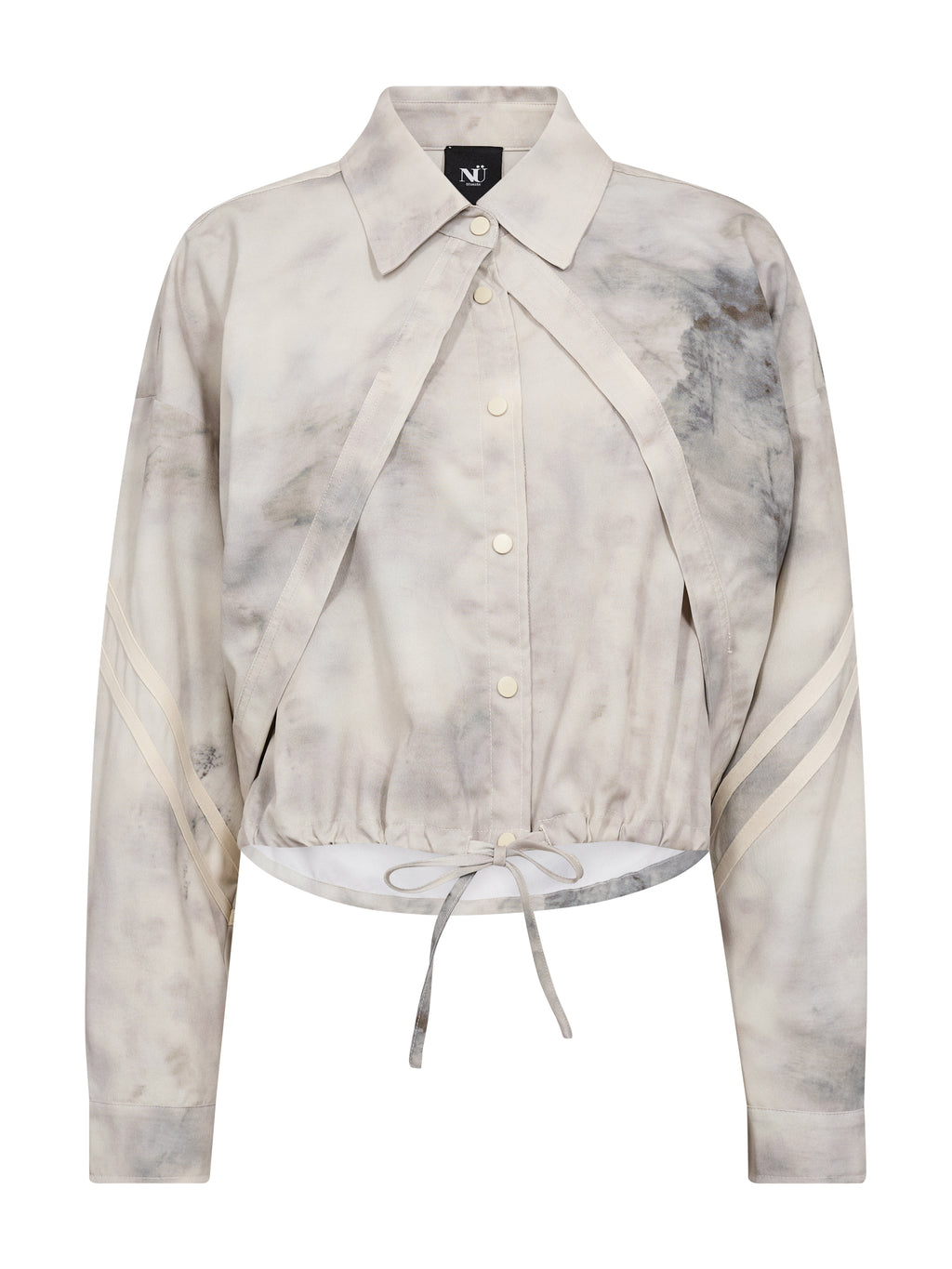 Dit shirt heeft een ontspannen en licht stoere uitstraling dankzij het licht gemarmerde patroon en de korte lengte. De klassieke kraag en knoopsluiting aan de voorkant zorgen voor een herkenbare look, terwijl de opvallende naden en lijnen op de voorkant en mouwen structuur en karakter toevoegen. Het koord in de zoom maakt het mogelijk de pasvorm aan te passen en geeft het shirt een meer ontspannen vorm. De achterkant is eenvoudig gehouden en valt licht over de rug. Draag het met de bijpassende broek voor een complete set, of combineer het met een effen broek om de details van het jasje nog meer te benadrukken.