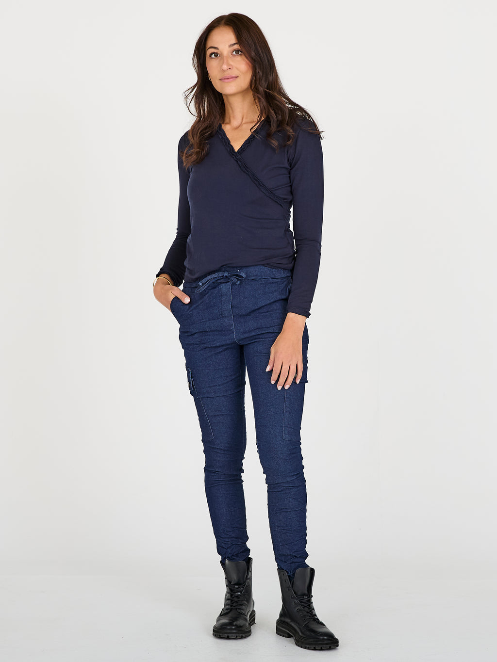 Voeg zowel comfort als karakter toe aan de garderobe met deze denim-look broek. Het zachte materiaal met stretch zorgt voor goede bewegingsvrijheid, terwijl de gekreukelde look en de cargogeïnspireerde details zorgen voor een ontspannen en moderne uitstraling. De broek heeft een smalle pasvorm, een elastische tailleband met trekkoord en handige klepzakken op de benen. Stijl ze met een oversized overhemd en platte schoenen voor een moeiteloze en stijlvolle outfit. (Omdat de broek klein uitvalt, wordt aangeraden om een maat kleiner te nemen.) (- Stretchmateriaal. - Gekreukelde denim-look. - Klepzakken op de benen.)
