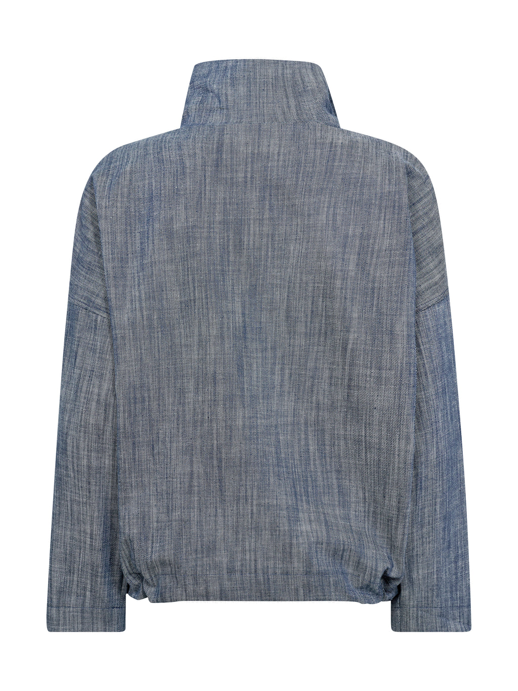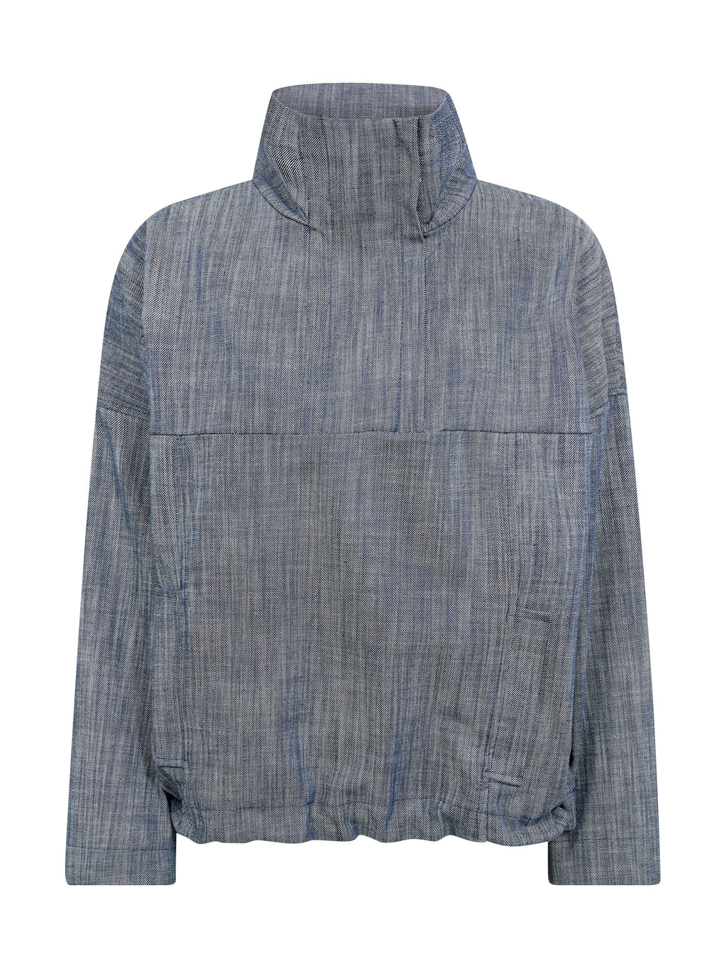 Dit bovenstuk combineert een gestructureerd materiaal met een eenvoudig maar verfijnd ontwerp. Het heeft een hoge kraag met korte rits, wijde mouwen en een licht boxy model, wat zorgt voor een ontspannen en tegelijkertijd goed geklede silhouet. De achterkant volgt dezelfde eenvoudige uitdrukking als de voorkant, waardoor het gemakkelijk is om het te stylen doorheen de seizoenen.