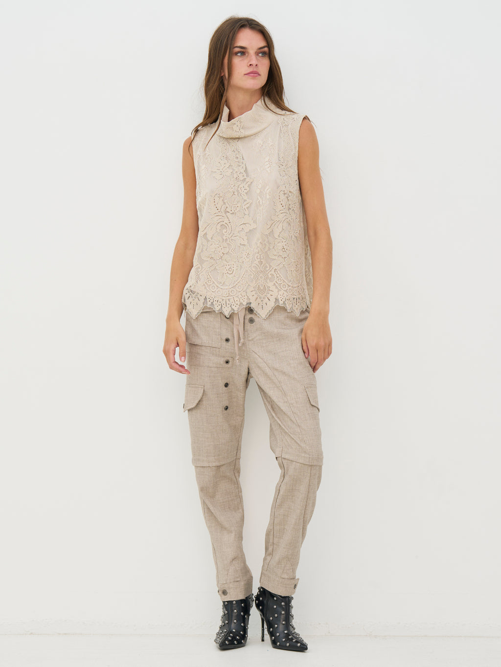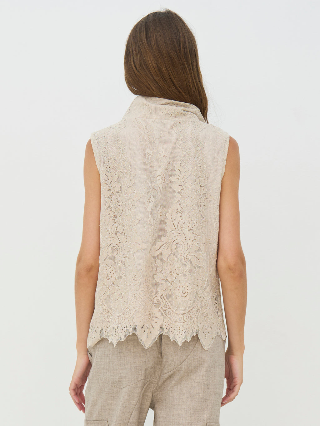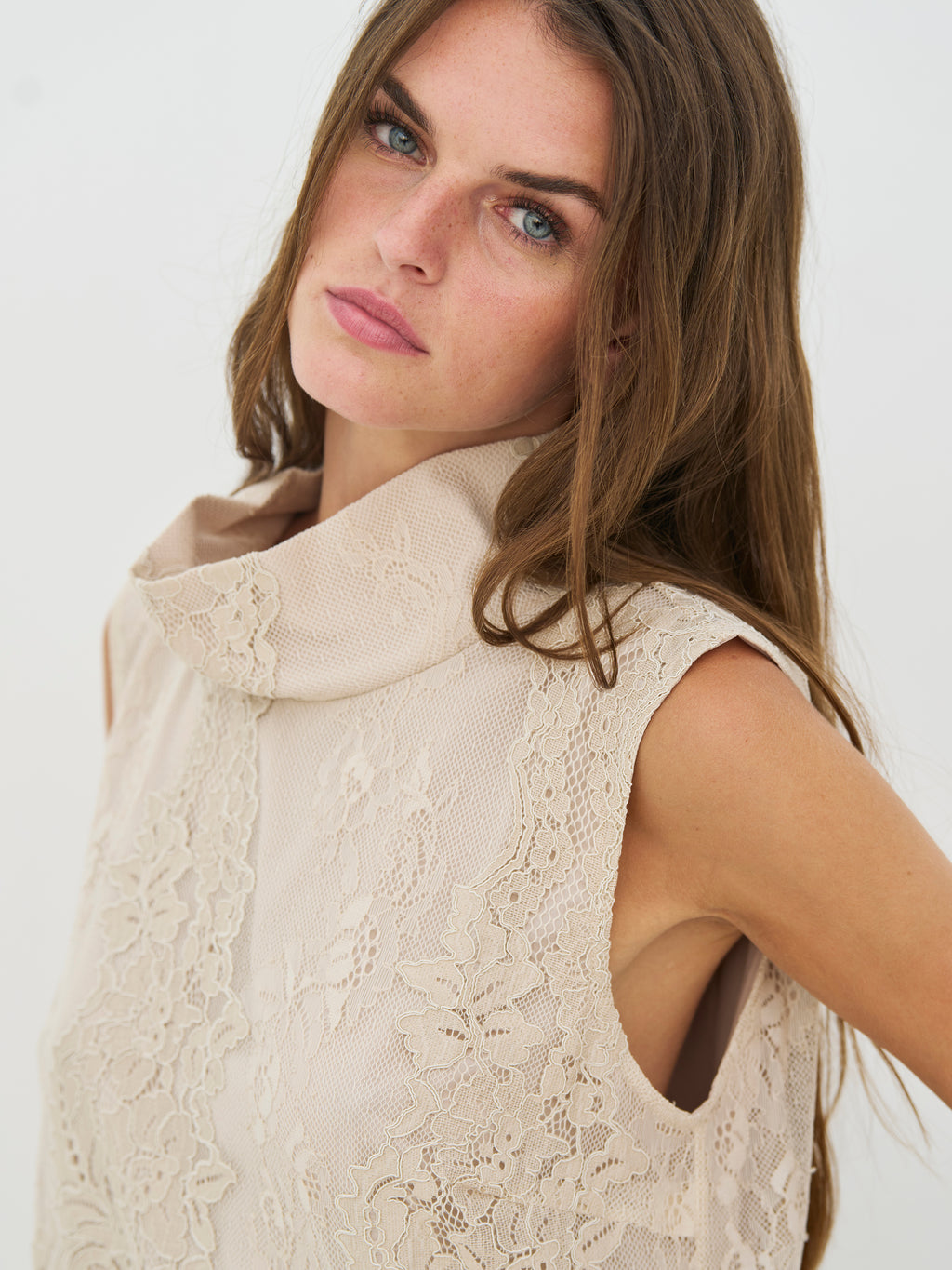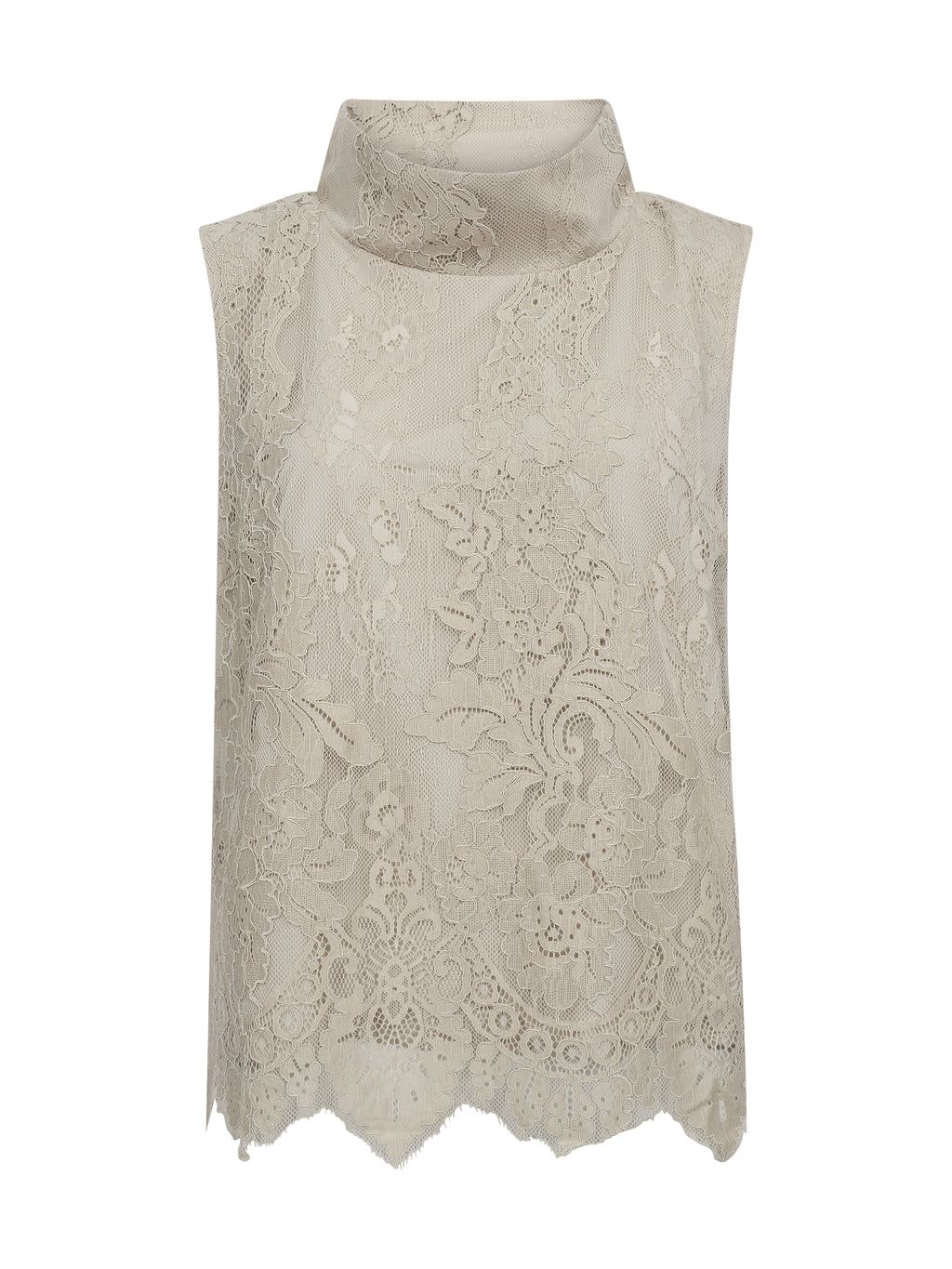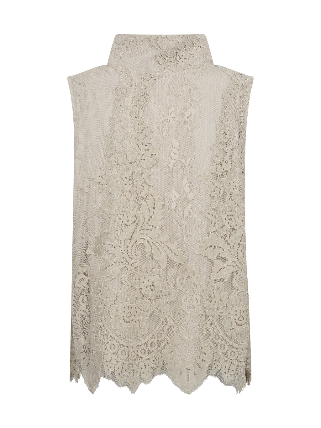 Deze top is gemaakt van kantstof en heeft een vrouwelijke uitstraling met een hoge hals en mouwloos ontwerp. Het kant zorgt voor een subtiel spel in het oppervlak, terwijl de onderkant licht gegolfd is en het ontwerp op een mooie manier afrondt. Zowel aan de voorkant als aan de achterkant is de uitstraling gelijkmatig, waardoor de top rustig en licht om het lichaam valt. Het is gemakkelijk om de top zowel voor dagelijks gebruik als voor meer feestelijke gelegenheden te stylen. Style de top met een broek, rok of onder een jas of blazer.