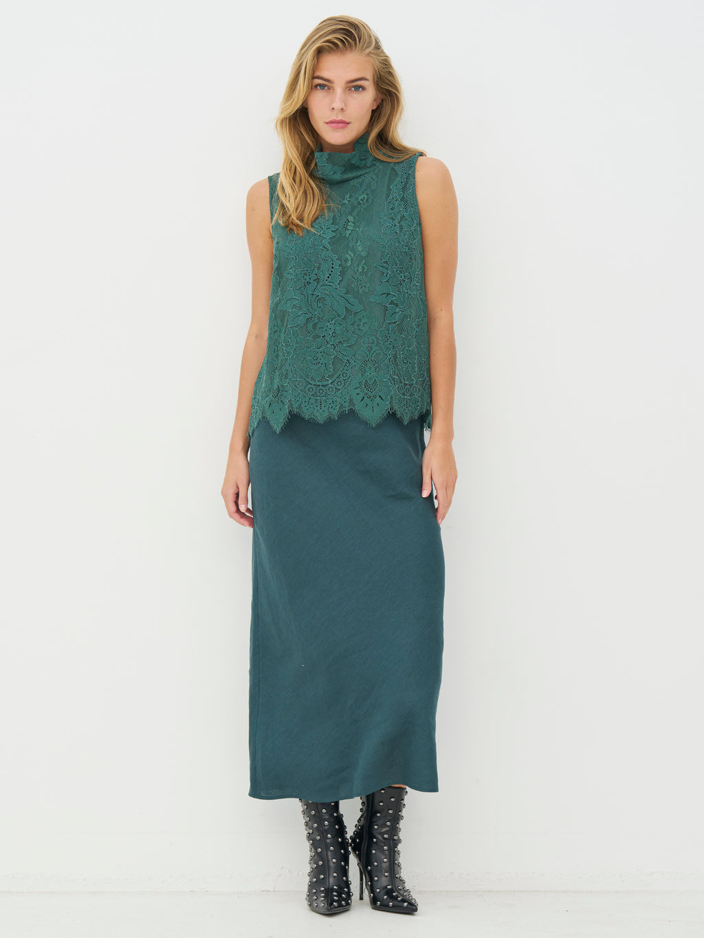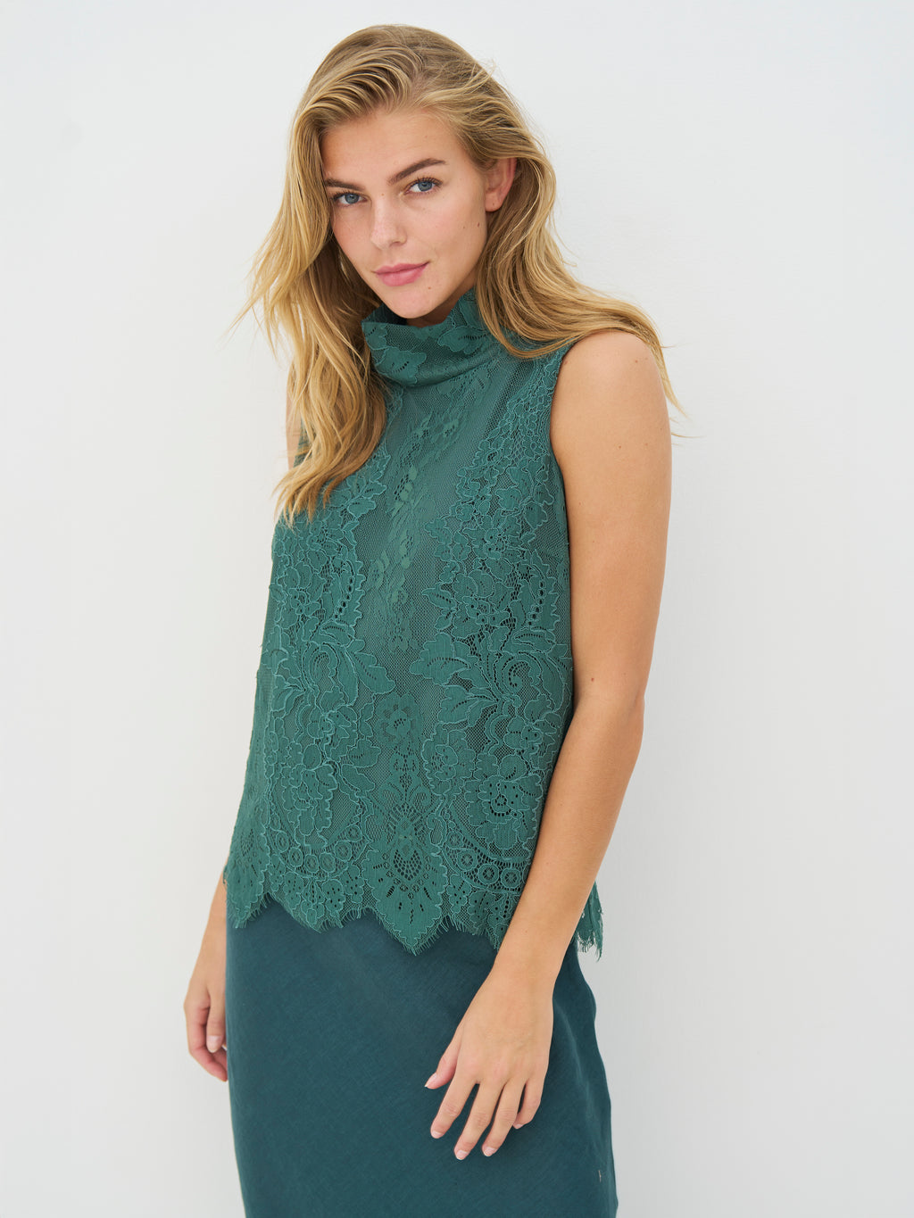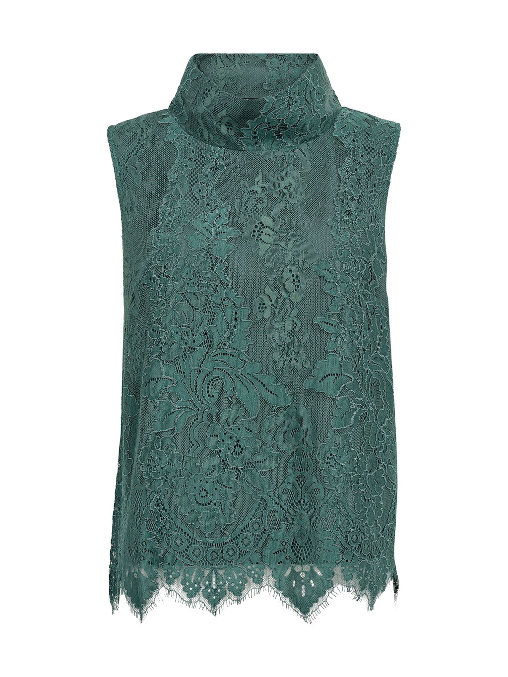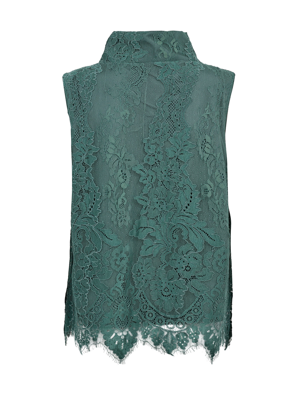 Deze top is gemaakt van kantstof en heeft een vrouwelijke uitstraling met een hoge hals en mouwloos ontwerp. Het kant zorgt voor een subtiel spel in het oppervlak, terwijl de onderkant licht gegolfd is en het ontwerp op een mooie manier afrondt. Zowel aan de voorkant als aan de achterkant is de uitstraling gelijkmatig, waardoor de top rustig en licht om het lichaam valt. Het is gemakkelijk om de top zowel voor dagelijks gebruik als voor meer feestelijke gelegenheden te stylen. Style de top met een broek, rok of onder een jas of blazer.