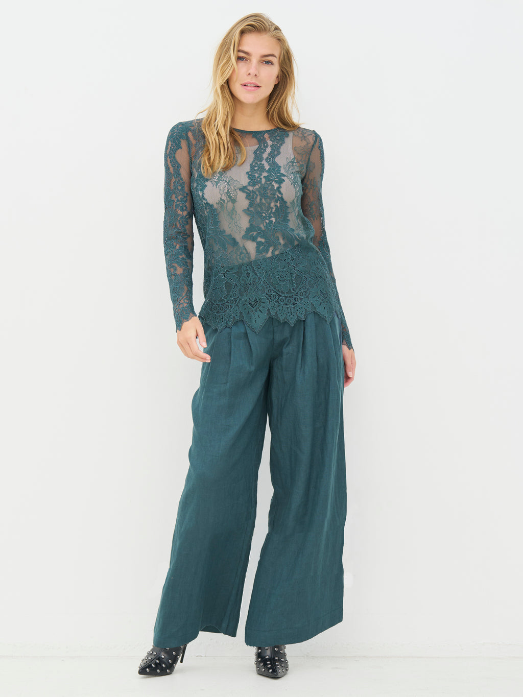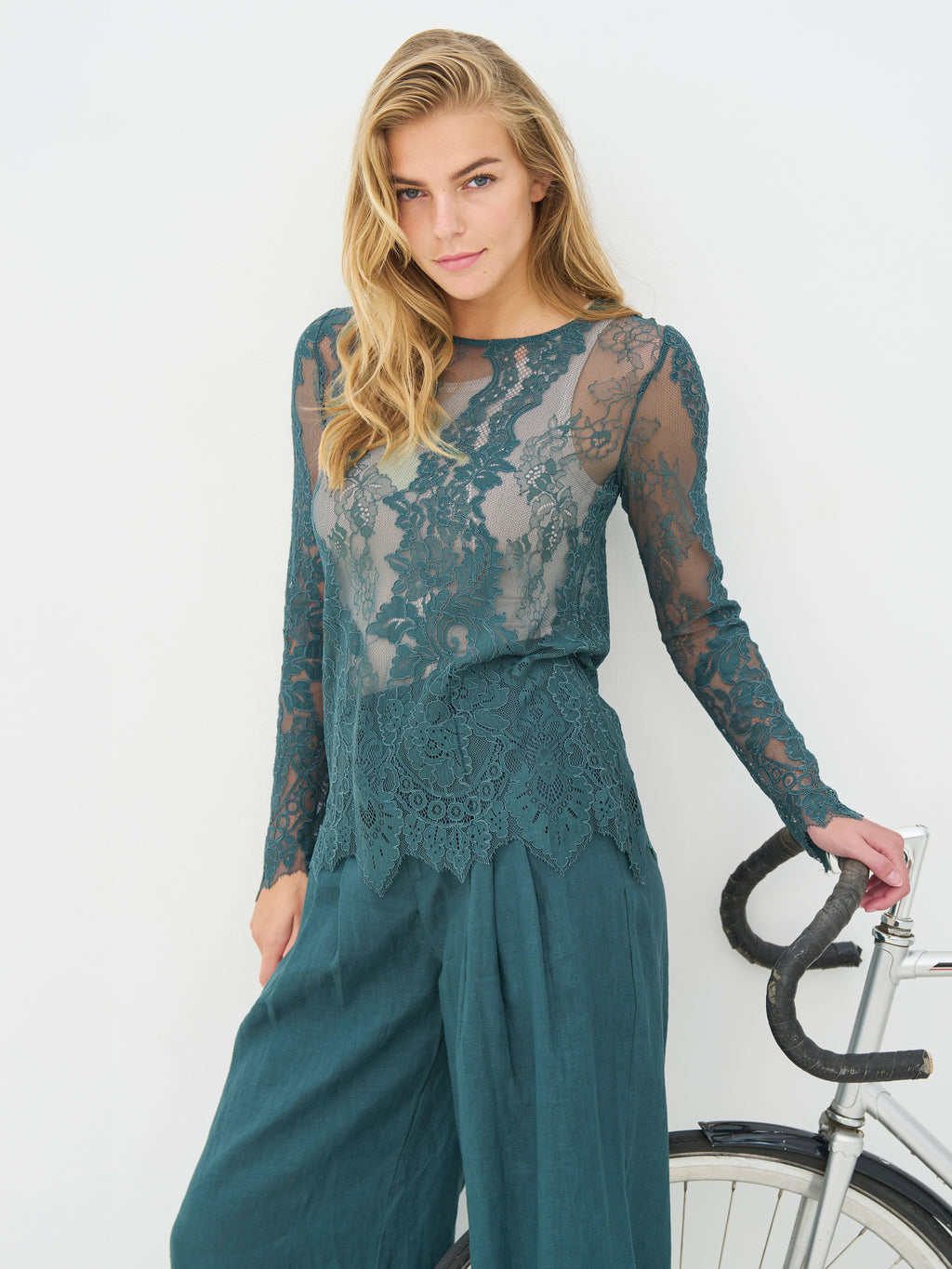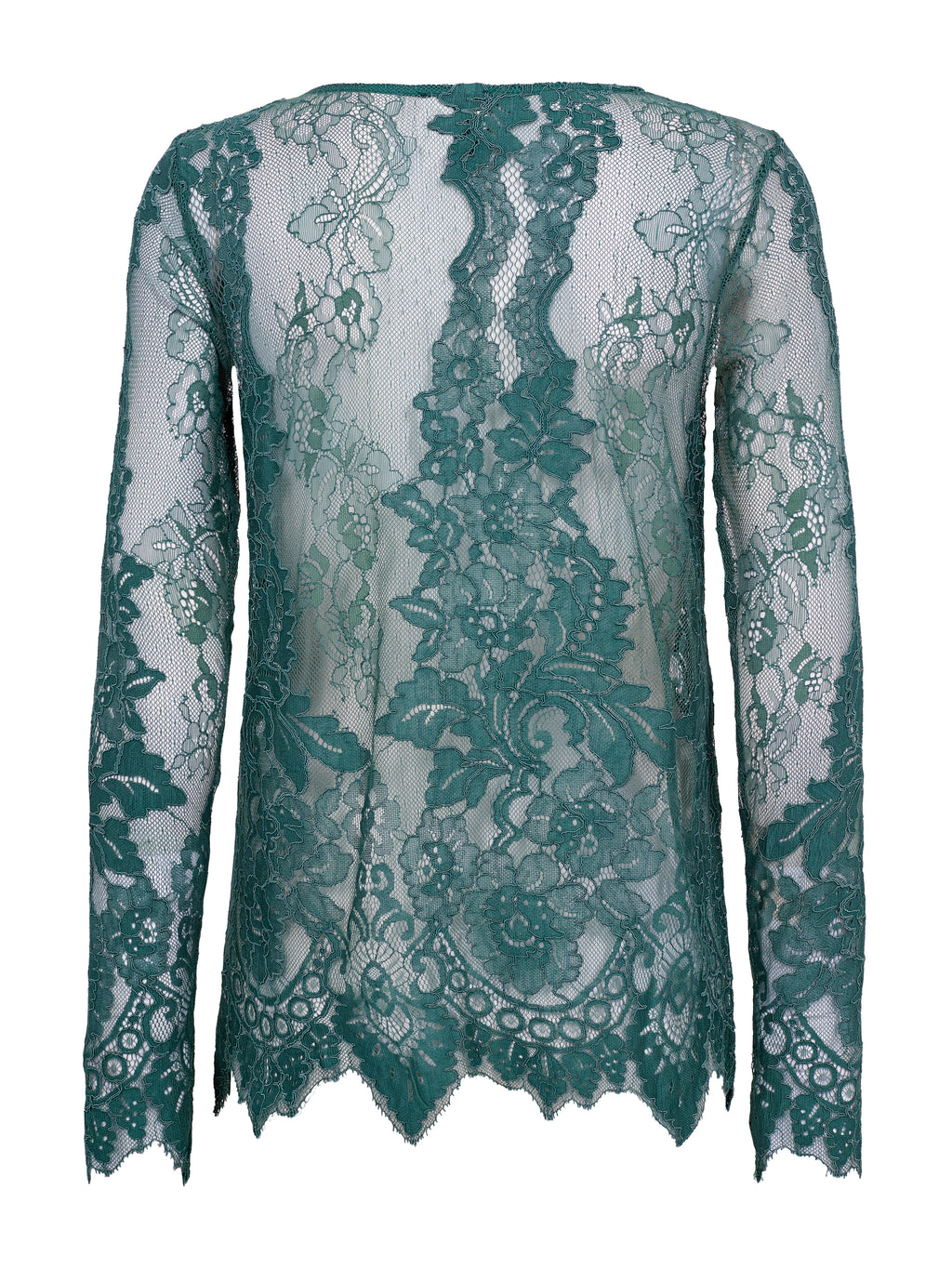Deze kanten blouse heeft een vrouwelijke en elegante uitstraling met doorschijnende kant en een duidelijk bloemenpatroon. Het lichte materiaal geeft diepte aan de look en werkt prachtig als laag over een eenvoudige top. De randen zijn afgewerkt met een licht golvende rand, wat zorgt voor een mooie en nette afwerking. De blouse is comfortabel om te dragen en kan zowel casual als bij meer feestelijke gelegenheden worden gestyled - alleen of onder een blazer of trui.
