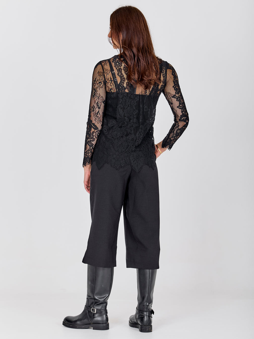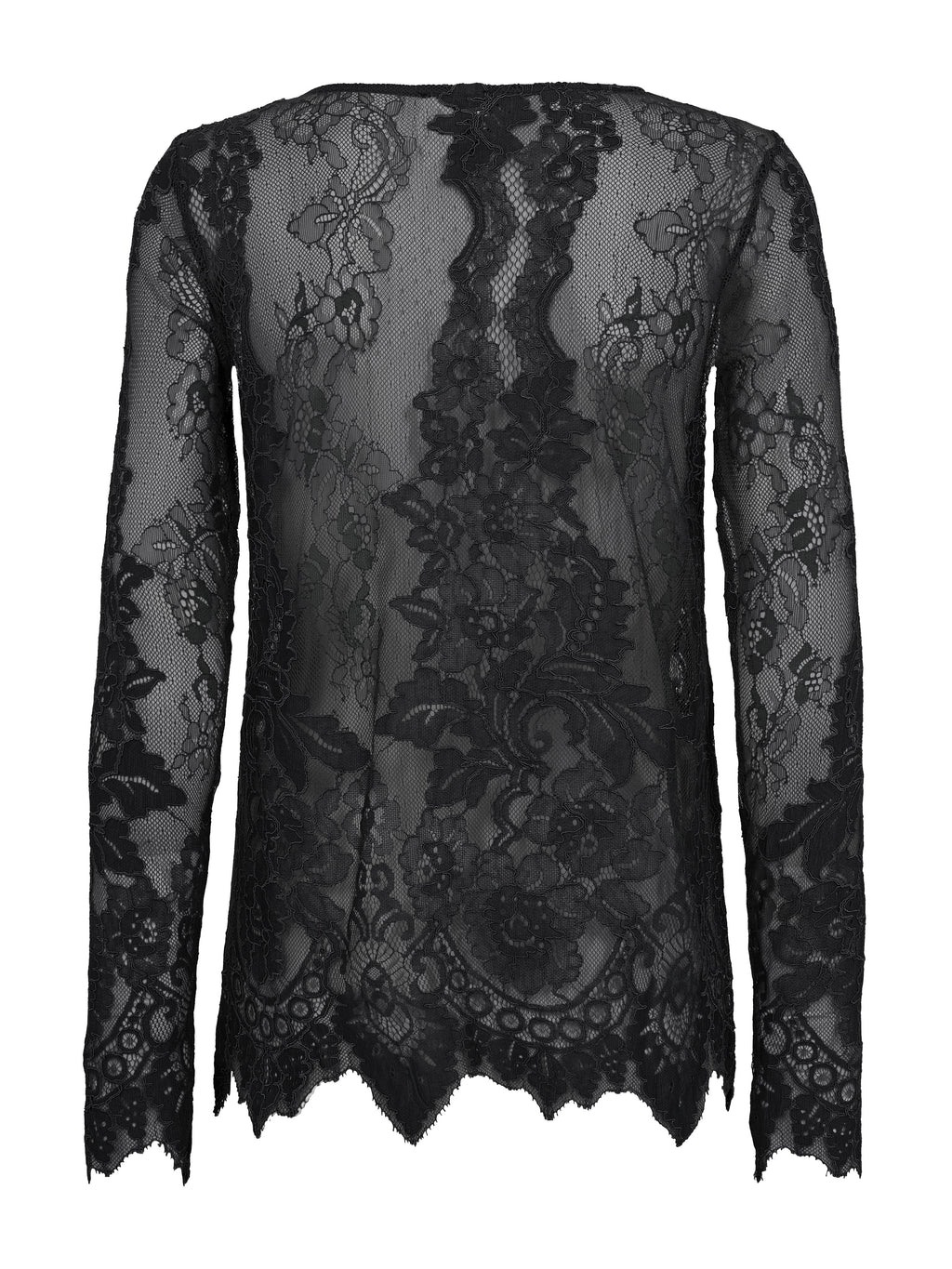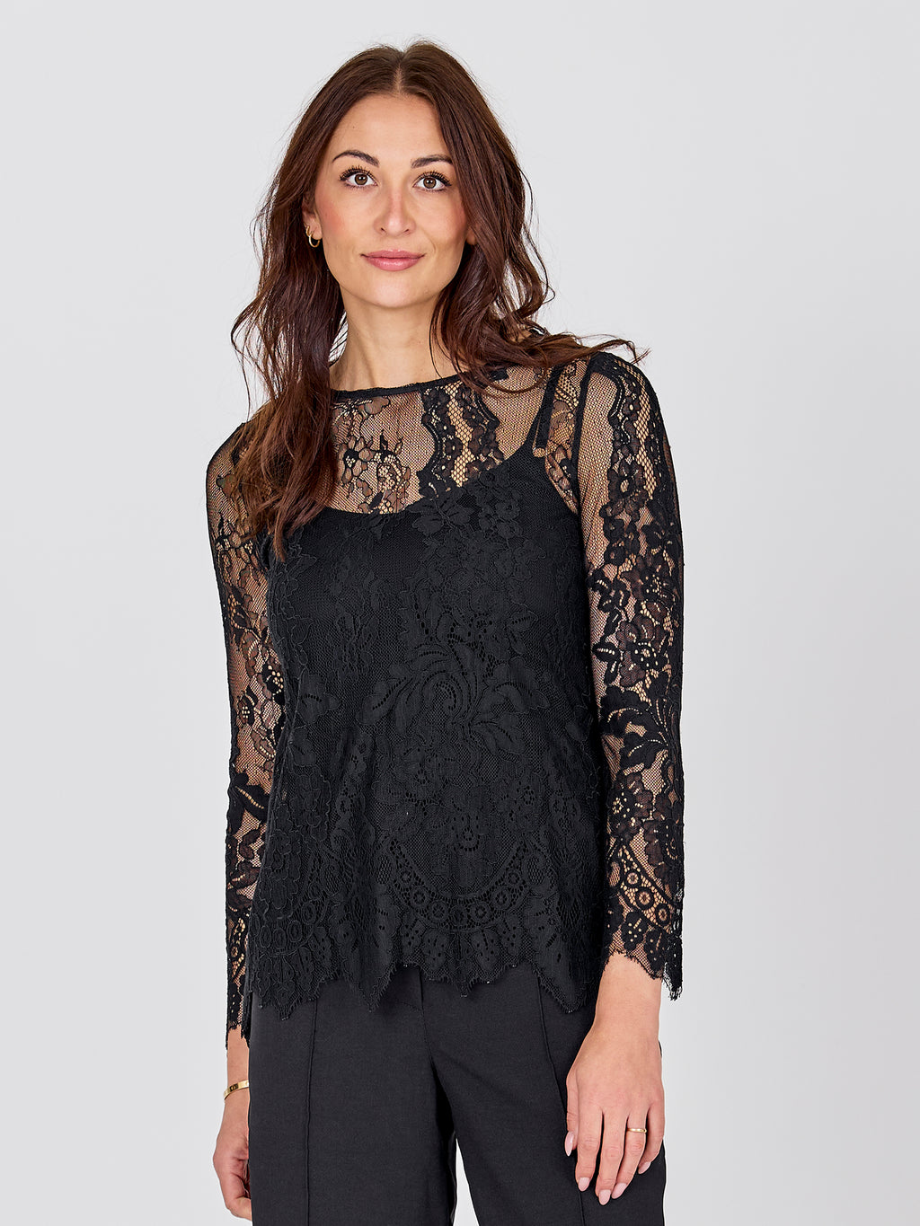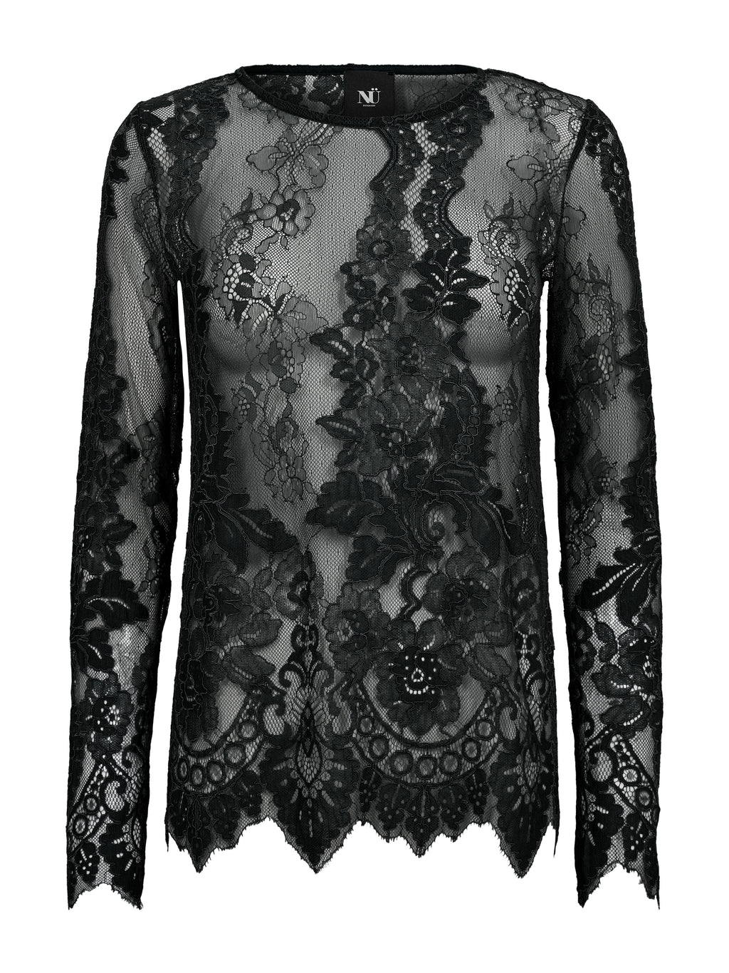 Deze kanten blouse heeft een vrouwelijke en elegante uitstraling met doorschijnende kant en een duidelijk bloemenpatroon. Het lichte materiaal geeft diepte aan de look en werkt prachtig als laag over een eenvoudige top. De randen zijn afgewerkt met een licht golvende rand, wat zorgt voor een mooie en nette afwerking. De blouse is comfortabel om te dragen en kan zowel casual als bij meer feestelijke gelegenheden worden gestyled - alleen of onder een blazer of trui.
