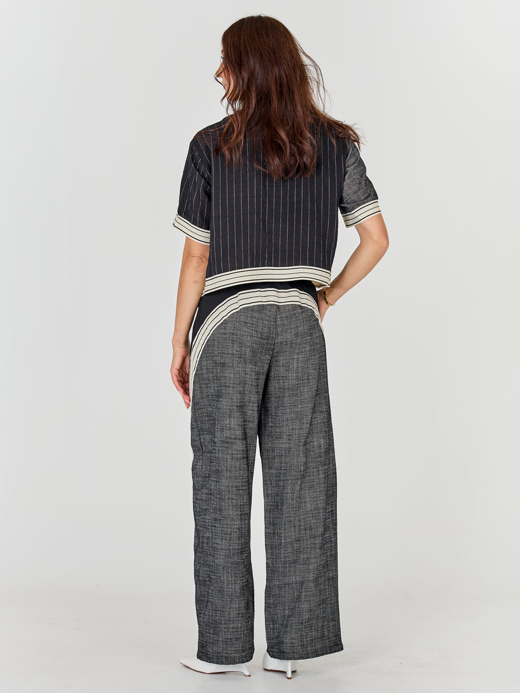 Een sportief ontwerp ontmoet gestructureerd contrast in deze wijde broek. De voorkant heeft een glad materiaal met decoratieve strepen langs de pijpen, terwijl de achterkant een grovere, geweven kwaliteit biedt die zorgt voor een spannend samenspel. De broek heeft elastiek en een trekkoord in de taille voor een goede pasvorm en hoog comfort.