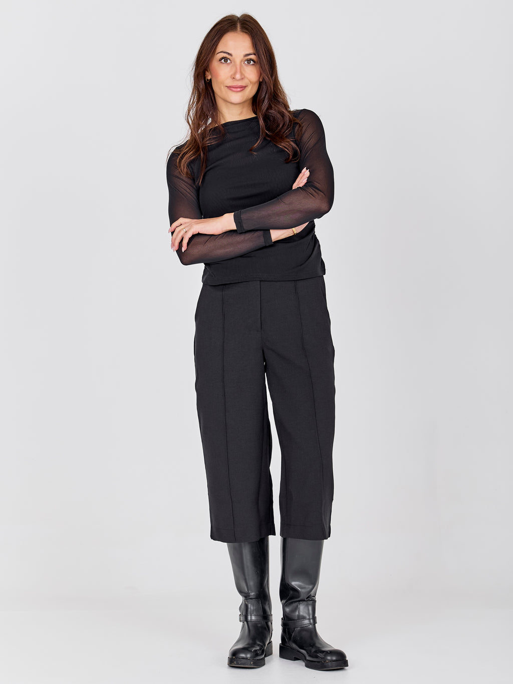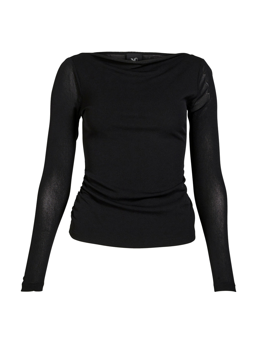 Maak een elegante en eenvoudige uitdrukking met deze T-shirt met lange mouwen in een lichtgewicht, transparant materiaal. De nauwsluitende snit accentueert de figuur, terwijl de delicate rimpels aan de zijkanten subtiele details en beweging toevoegen. De boothalslijn geeft de T-shirt een vrouwelijke touch en maakt het gemakkelijk te stylen voor zowel overdag als 's avonds.