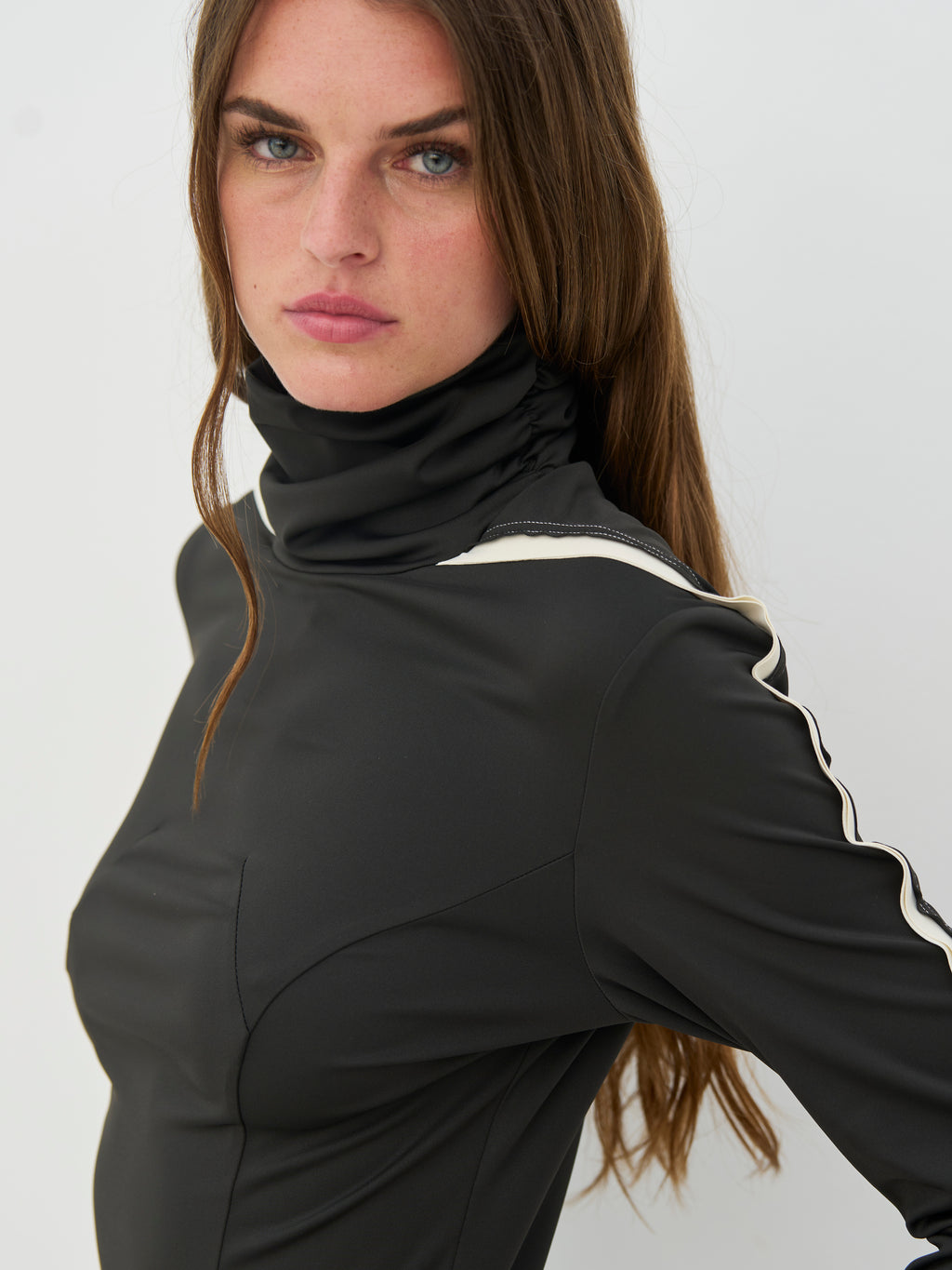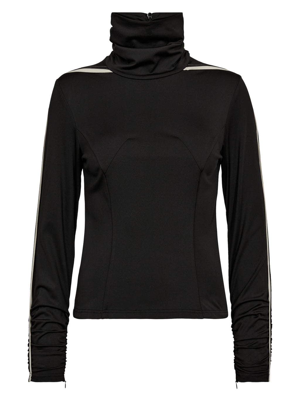 De blouse heeft een hoge kraag die zorgt voor een coole en stijlvolle uitstraling. De mouwen zijn voorzien van een 3D-detail dat een subtiele touch toevoegt aan het eenvoudige ontwerp. De voorkant heeft strakke lijnen en een gladde uitstraling, terwijl de achterkant simpel wordt gehouden. Style de blouse met leggings of een eenvoudige rok voor een sportieve en coole alledaagse look.