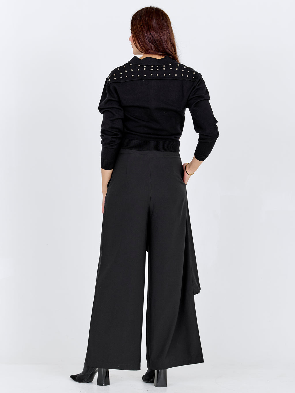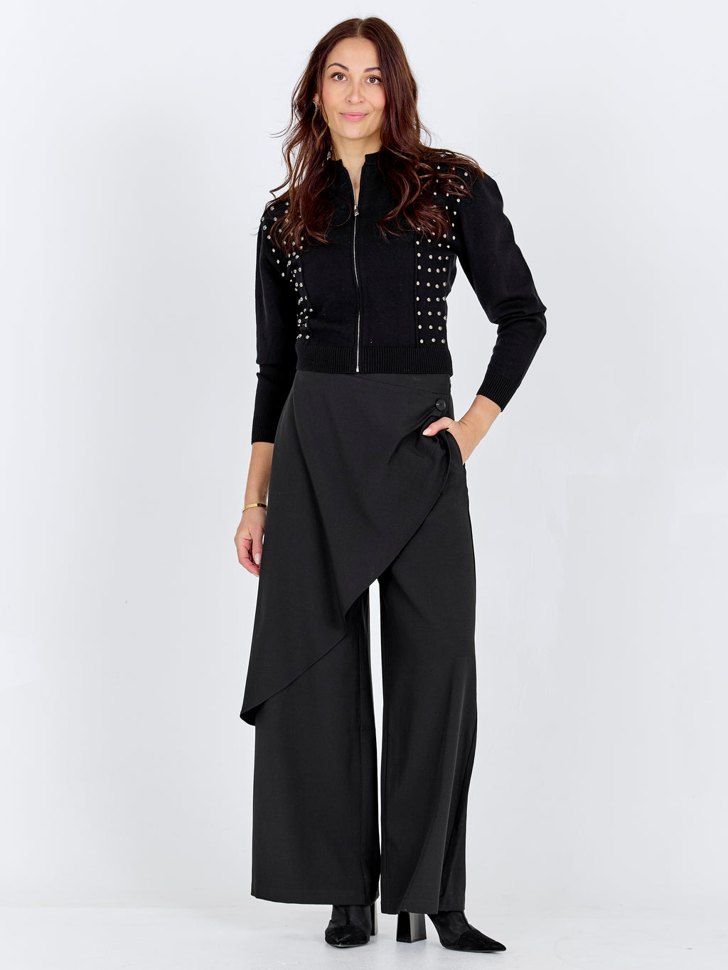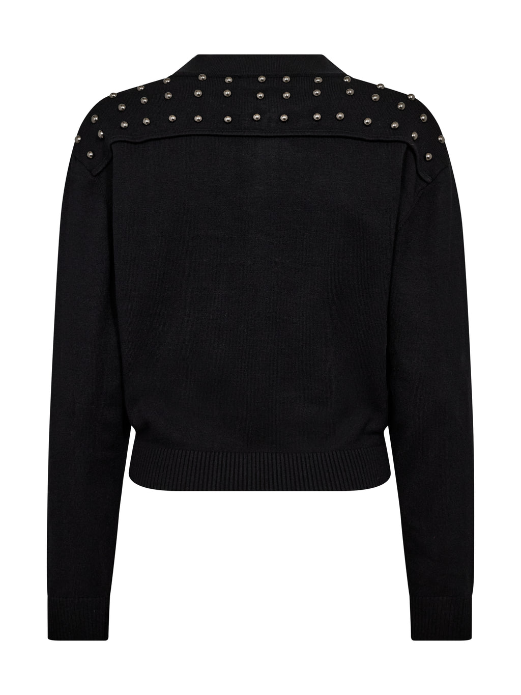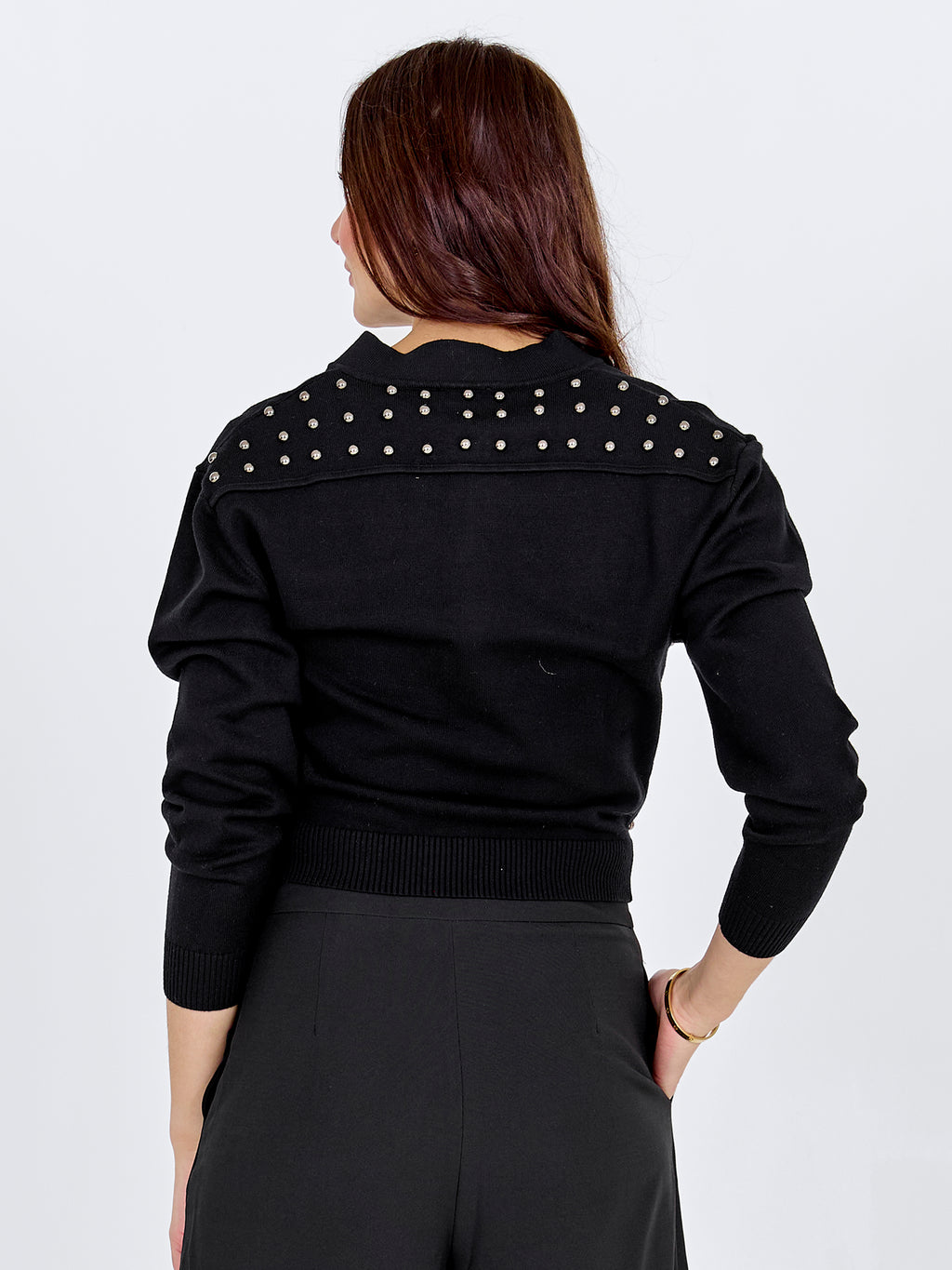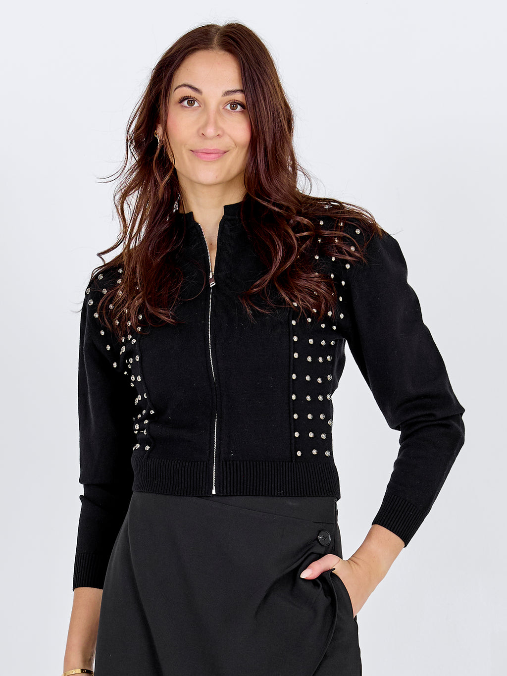 Deze cardigan heeft een korte en aansluitende snit met lange mouwen en een ronde hals. Aan de voorkant sluit hij met een rits, terwijl decoratieve studs aan de zijkanten een opvallende uitstraling geven. De achterkant is ontworpen met studs over de schouders, wat extra karakter toevoegt en een prachtig geheel vormt. Style de cardigan over een eenvoudige top of jurk, of gebruik hem als een gelaagde look voor dagelijks gebruik.