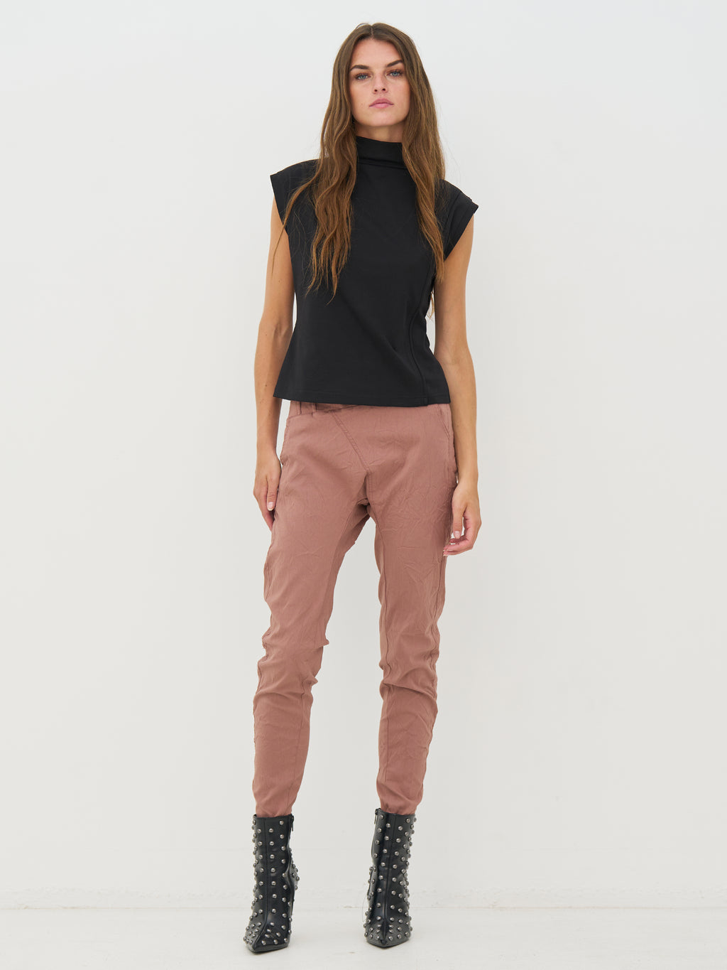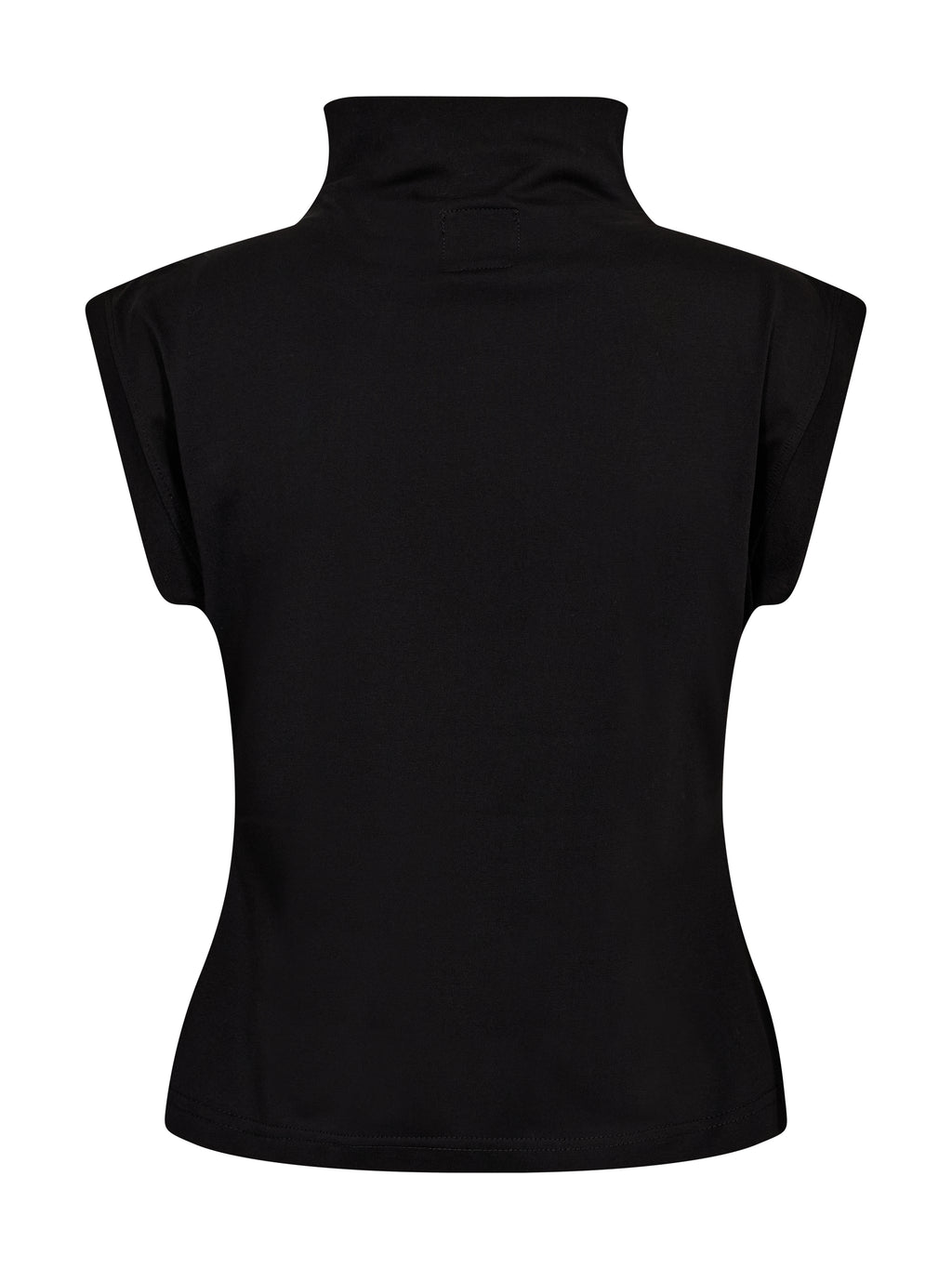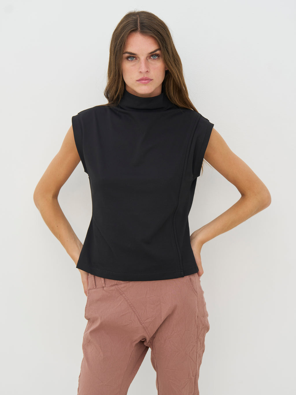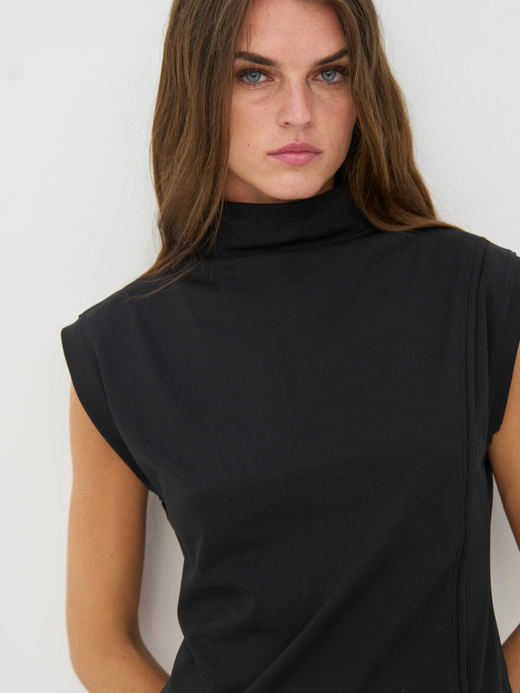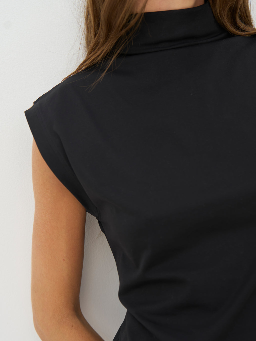 Deze top heeft een schone en eenvoudige uitstraling met een hoge hals en een rechte pasvorm. De lichte schouders geven wat structuur, terwijl het rekbare materiaal zorgt voor comfort en bewegingsvrijheid. Het ontwerp is zowel voor- als achteraan eenvoudig gehouden, waardoor de top op verschillende manieren gemakkelijk gestyled kan worden. Draag deze met zowel broeken als rokken - alleen of onder een blazer voor een coole complete look.