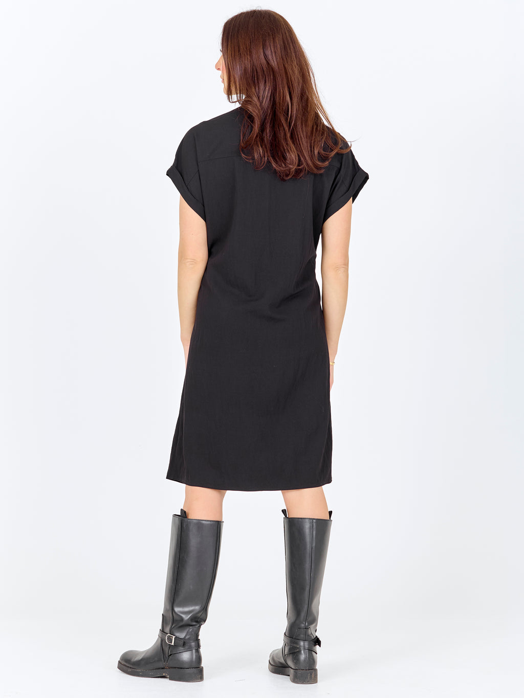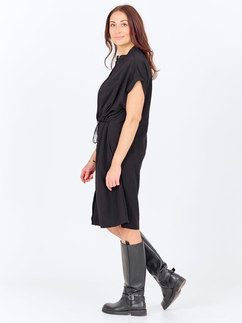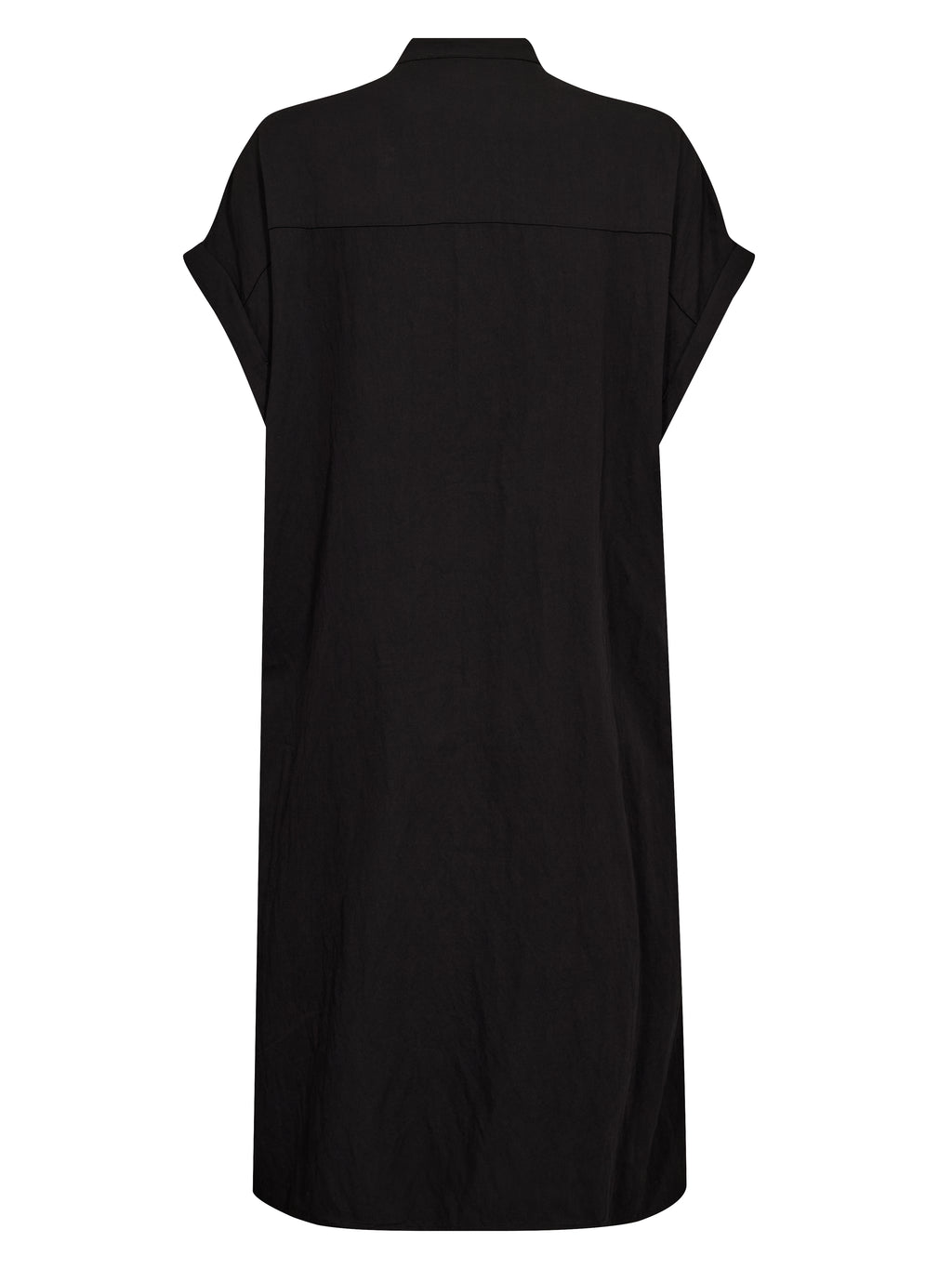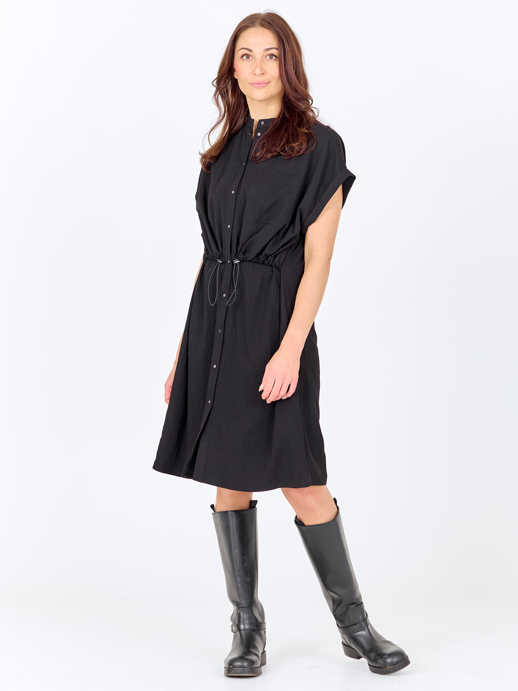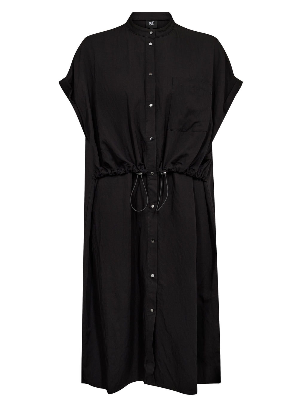 Deze jurk heeft een relaxte en eenvoudige uitstraling met korte mouwen en knoopsluiting helemaal vooraan. De hoge kraag geeft een strakke look, terwijl het koord in de taille verstelbaar is en de mogelijkheid biedt om de jurk gemakkelijk te verzamelen. Aan de voorkant heeft de jurk een borstzak en aan de achterkant is het ontwerp eenvoudiger met een rechte val. De jurk kan zowel gesloten als jurk worden gestyled, of licht open over broeken voor een meer casual look.