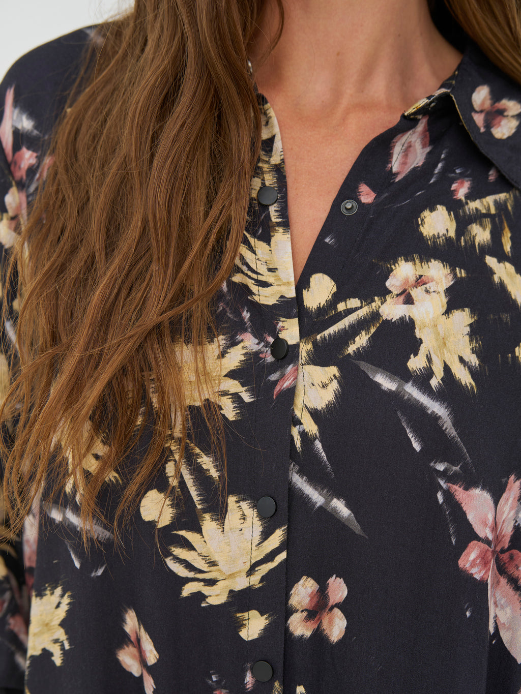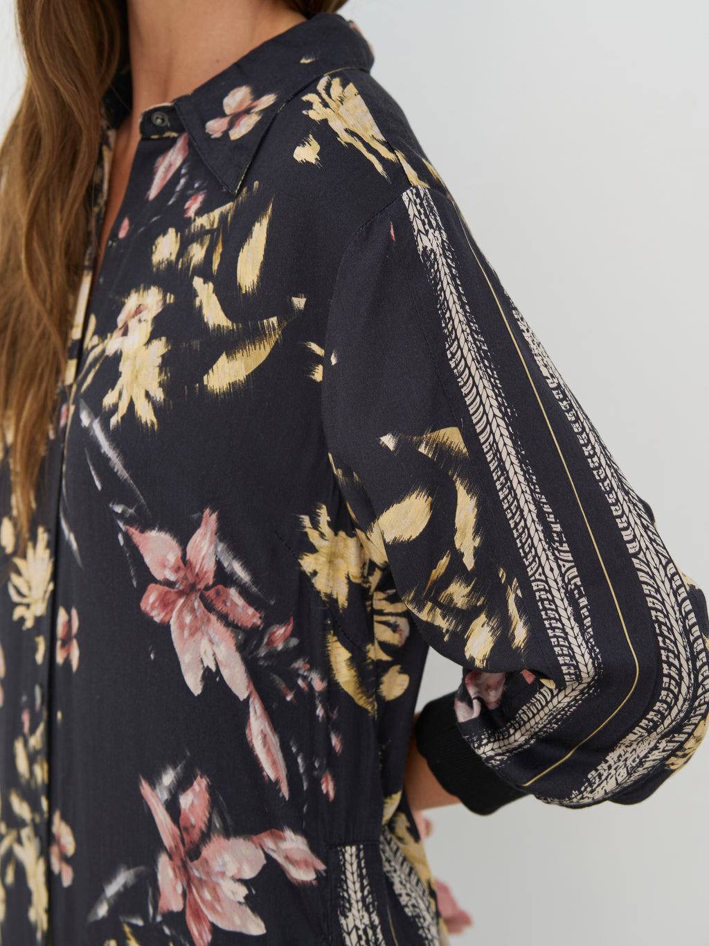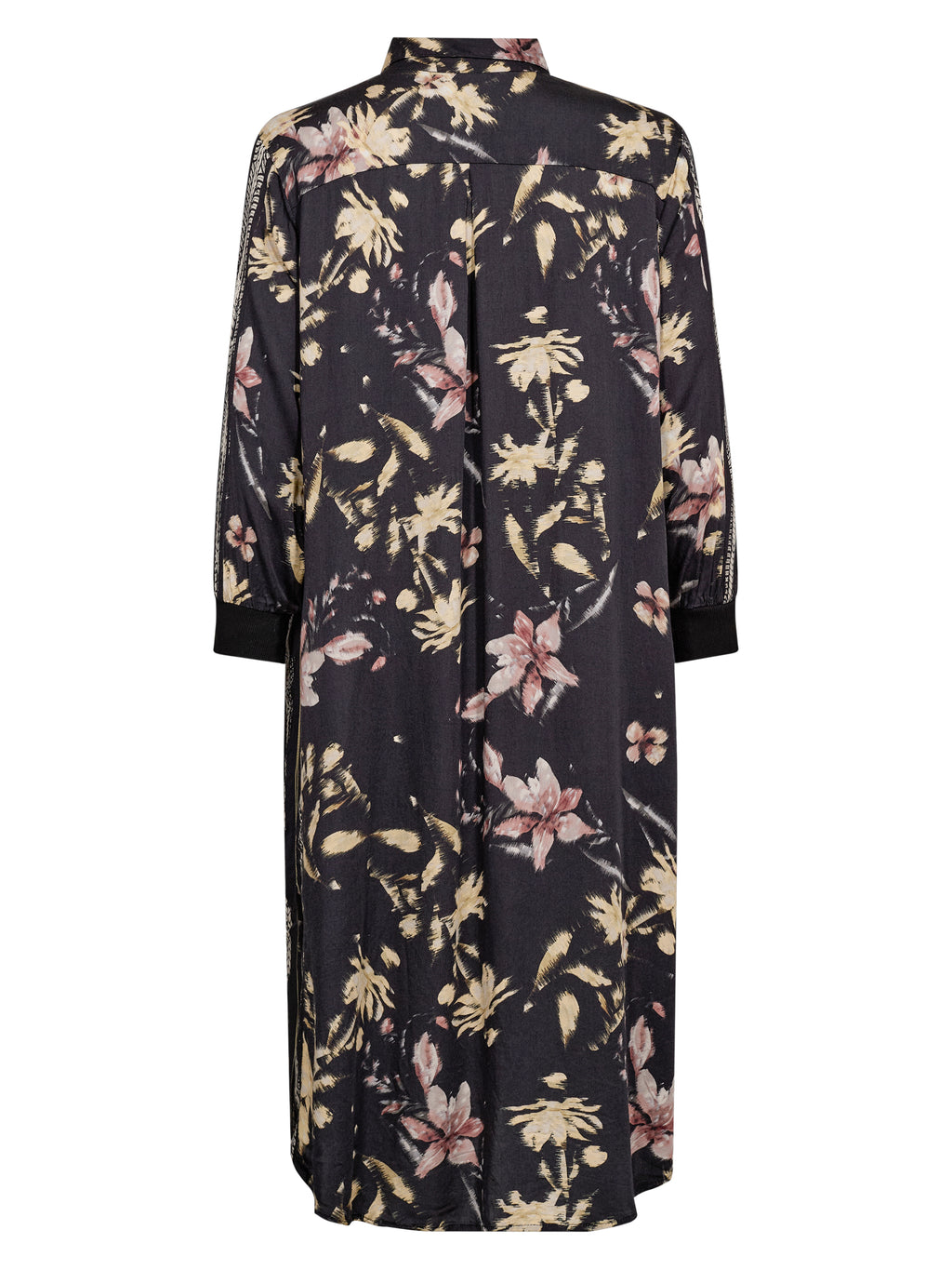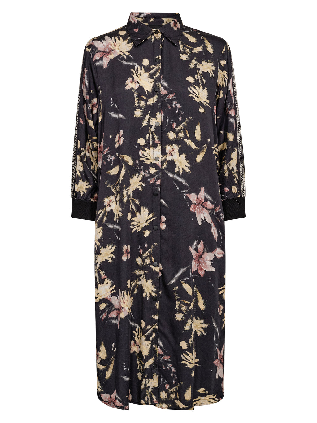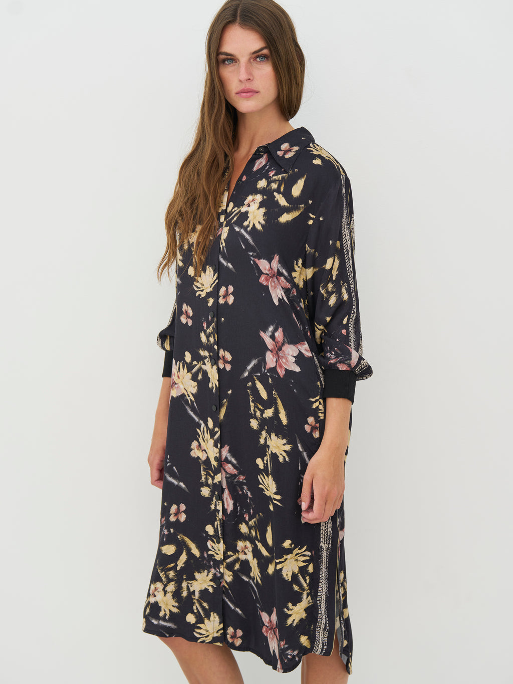 Deze jurk heeft een ontspannen en veelzijdige uitstraling met doorlopende knoopsluiting en klassieke kraag. Het print geeft de jurk karakter, terwijl de lange mouwen met manchetten de look netjes houden. Aan de zijkanten zijn er splitten die wat extra bewegingsvrijheid geven en hem comfortabel maken om te dragen. De achterkant is eenvoudig en valt recht naar beneden. Draag de jurk alleen of open over broeken en een top.
