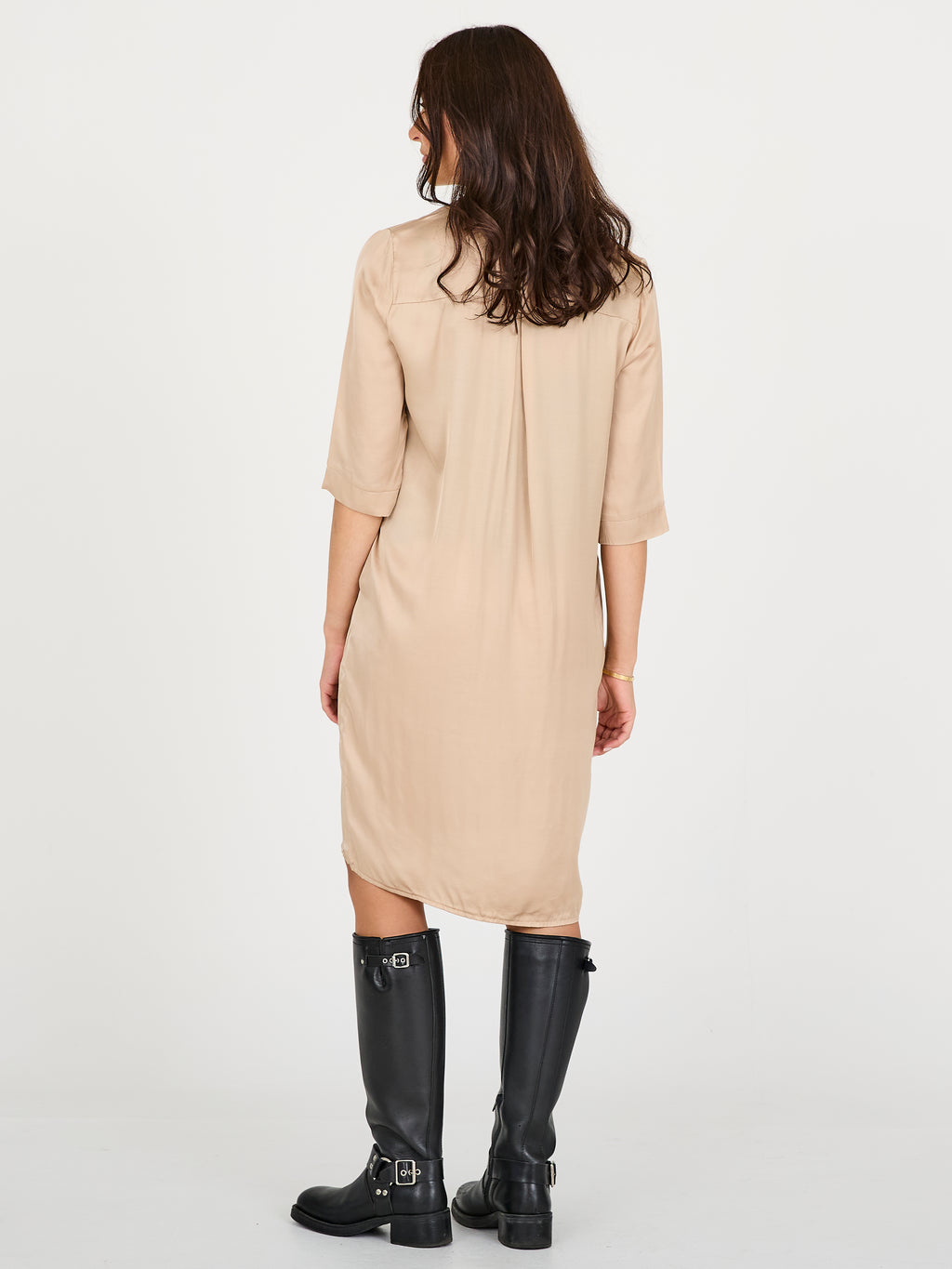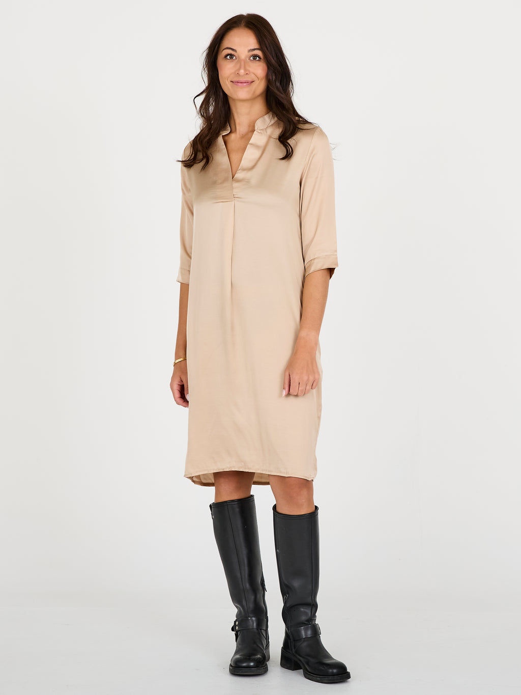 Creëer een elegante en moeiteloze look met deze losjes vallende jurk in een glad, licht glanzend materiaal. Het heeft een eenvoudige V-hals en een kraag met een op China geïnspireerde snit, evenals 3/4-mouwen die het minimalistische ontwerp benadrukken. Een subtiele plooi aan de achterkant zorgt voor extra bewegingsvrijheid en een prachtige val.