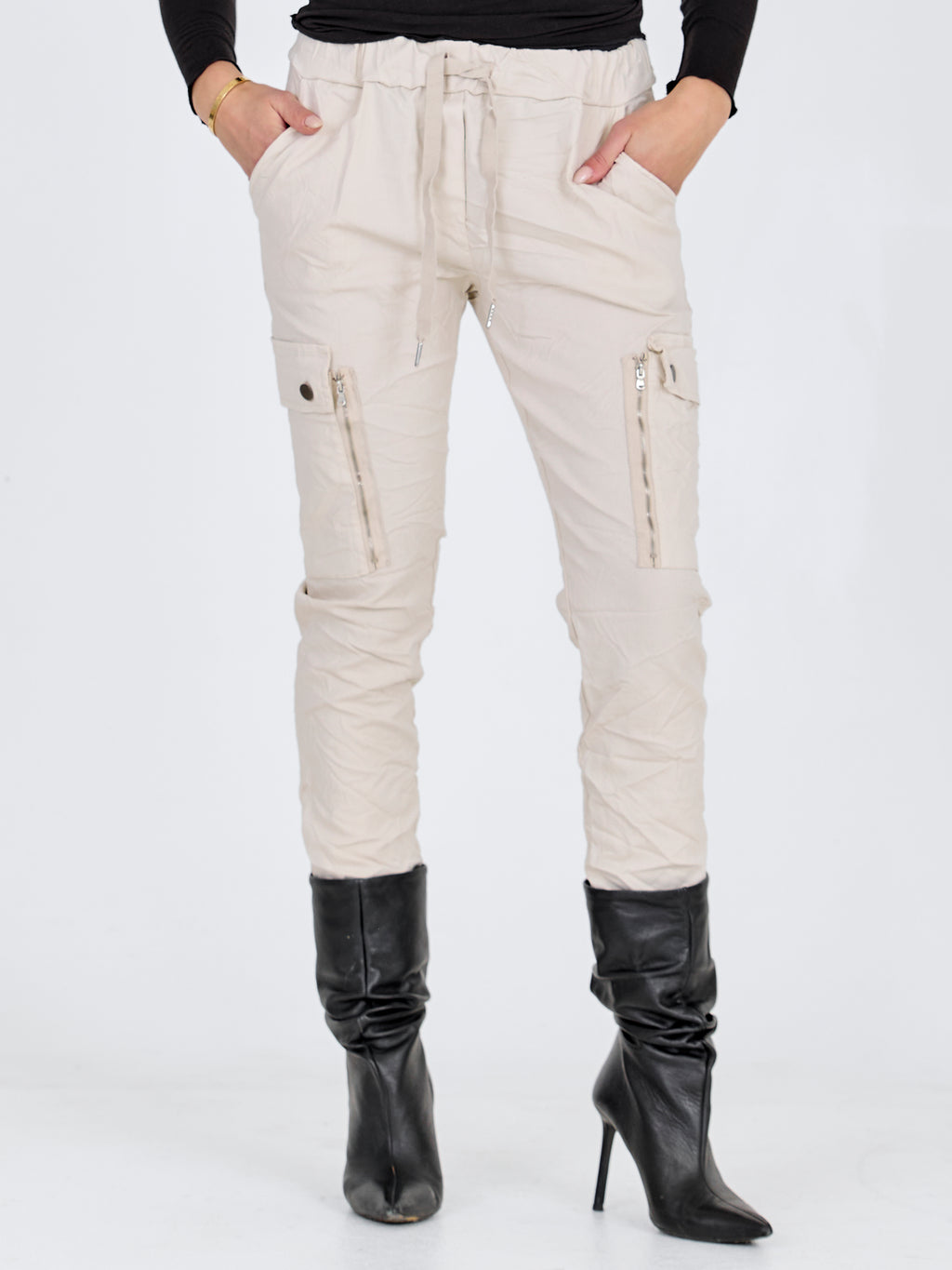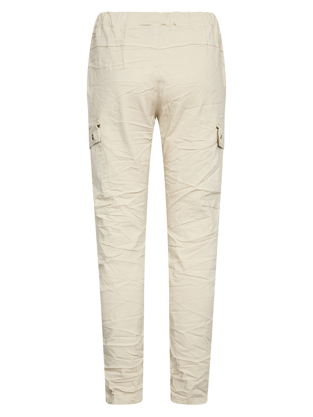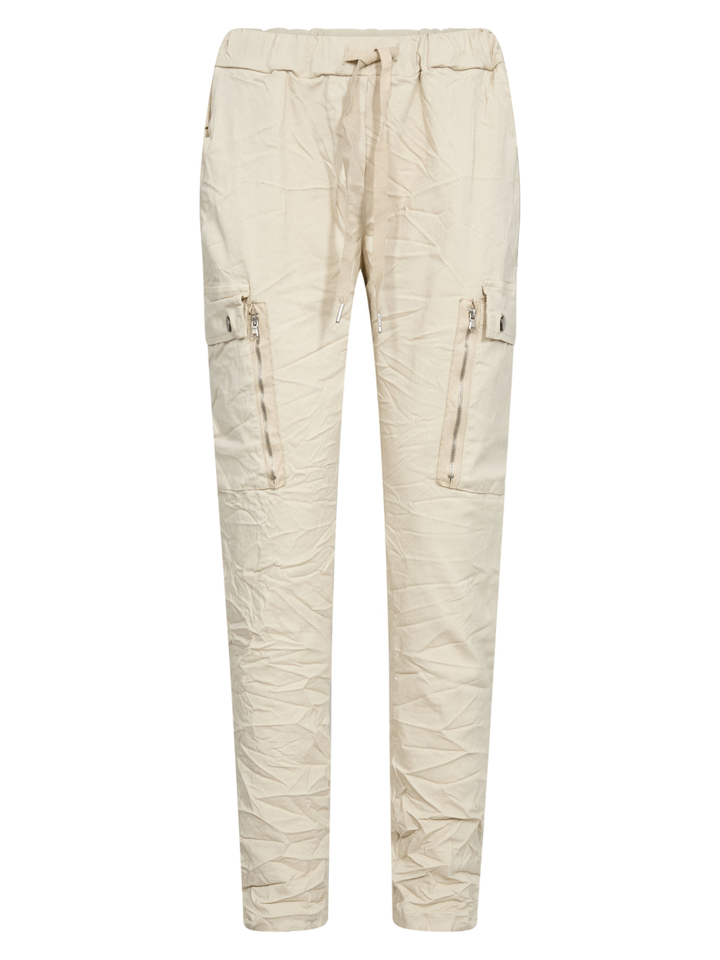 Deze coole broek is van een heerlijke kwaliteit katoen met veel stretch. De broek heeft een licht oversized pasvorm en een elastische taille met een strikceintuur, zodat fantastisch comfort gegarandeerd is. In het midden van de broek bevinden zich twee grote knoopzakken en een lange decoratieve rits voor een stoer detail.