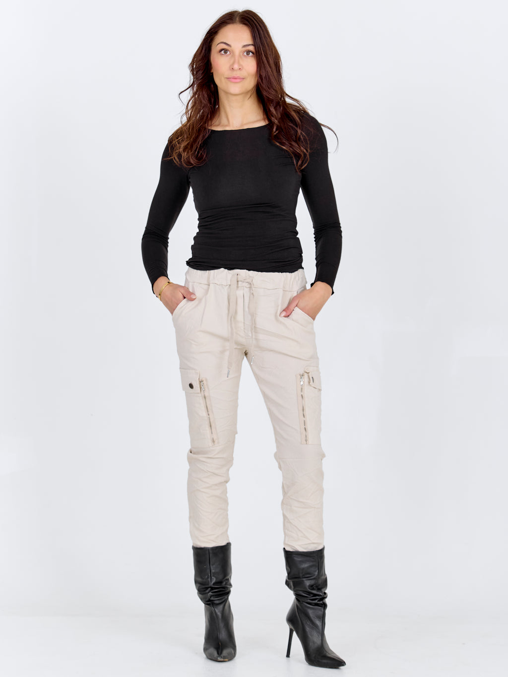 Onze populaire Carmen pasvorm staat bekend om het cargodesign en het comfortabele draagcomfort. De broeken in Carmen pasvorm zijn gemaakt van een uiterst elastisch materiaal dat mooi om de benen valt, met een normale, elastische taille met een strikceintuur. Kies uw gebruikelijke maat. Als u een strakkere pasvorm wilt, kunt u een maat kleiner kiezen, of een maat groter voor een meer oversized pasvorm.