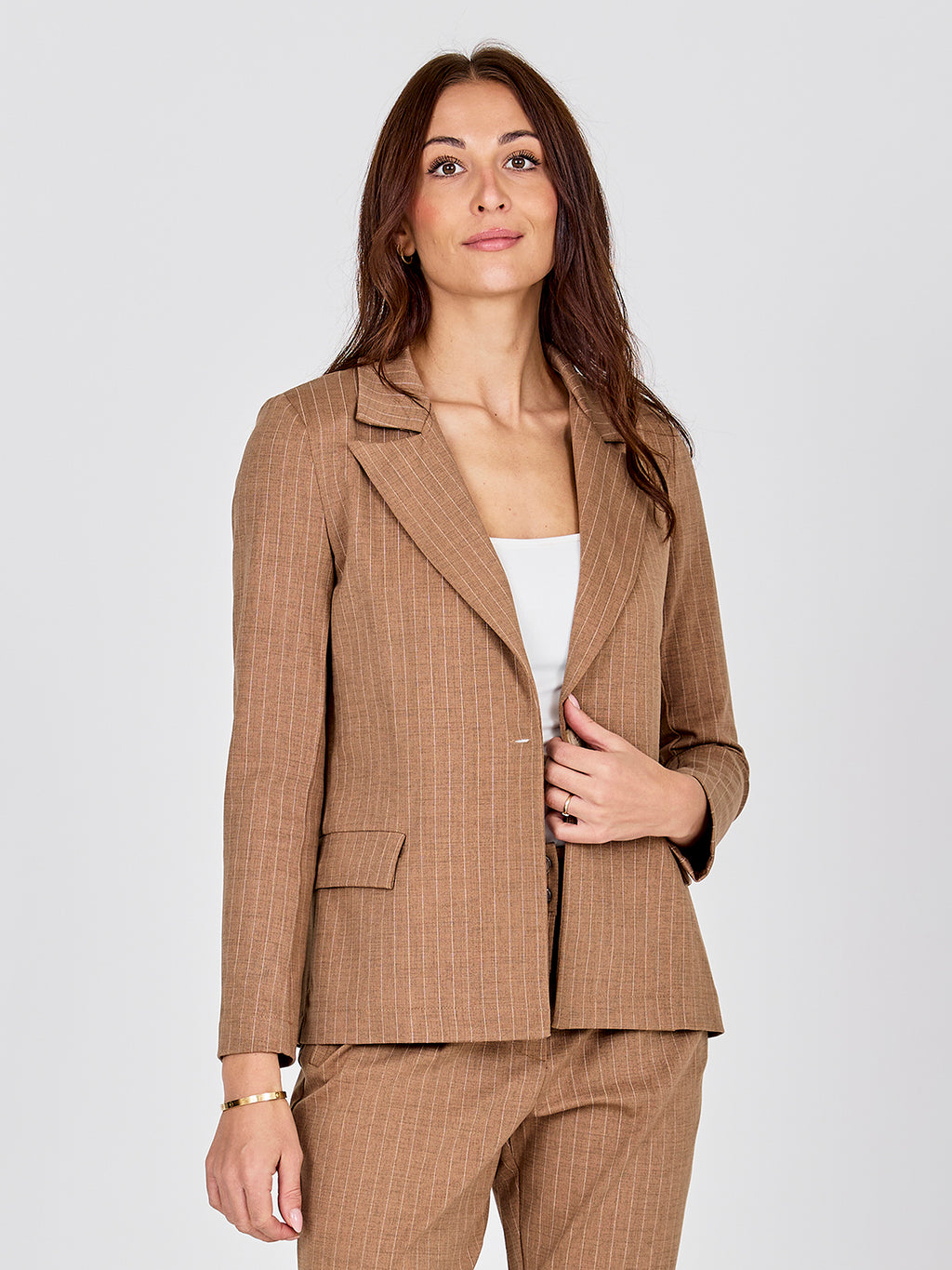 Verhoog je alledaagse look met deze strakke blazer, die klassieke details combineert met een moderne snit. Het heeft een enkele knoopsluiting aan de voorkant, puntige revers en twee klepzakken aan de voorkant die de elegante uitstraling compleet maken. Het subtiele, verticale patroon voegt een verfijnde touch toe aan de blazer, en de licht gestructureerde kwaliteit zorgt voor comfort.