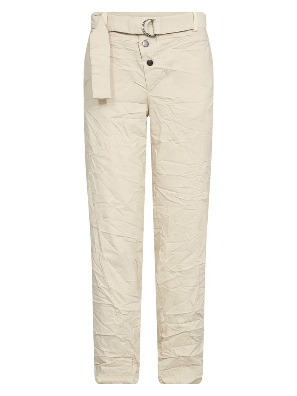 Deze broek is ontworpen met een nauwe pasvorm en een opvallende tailleband, wat zorgt voor een eenvoudige en tijdloze uitstraling. Aan de voorkant hebben ze een schuine knoopsluiting en een riem met metalen ring, die zorgt voor een strakke en speelse details. Aan de achterkant is het snit schoon met riemlussen en markeringen die de pasvorm benadrukken. Combineer ze met een lichte trui of een overhemd voor een casual, maar doordachte look voor elke dag.