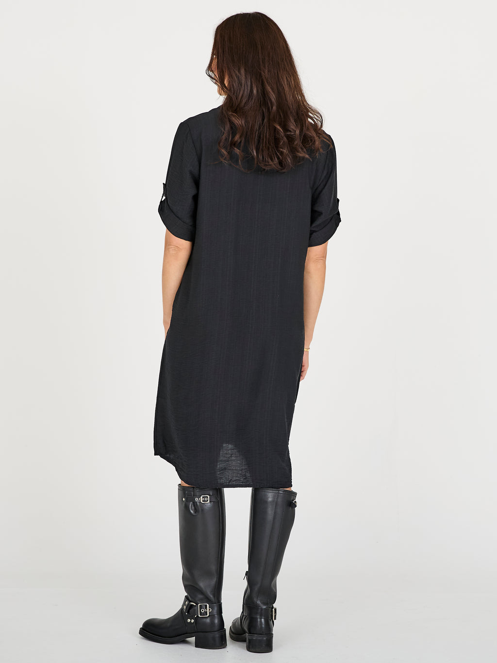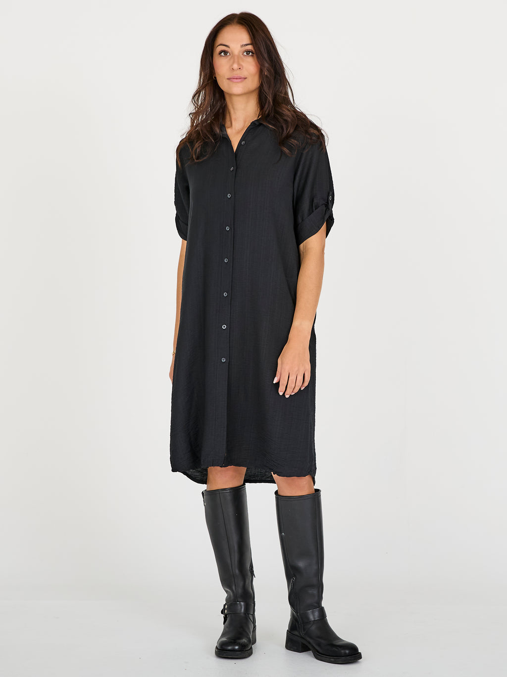 Deze hemdjurk combineert eenvoud en functionaliteit in een losse en comfortabele snit. Het heeft een volledige sluiting met knopen aan de voorkant, een klassieke hemdkraag, en manchetmouwen die verstelbaar zijn met knoopriemen. De jurk heeft zijzakken, wat een praktisch element toevoegt, en de licht gestructureerde kwaliteit maakt de ontspannen uitstraling compleet.