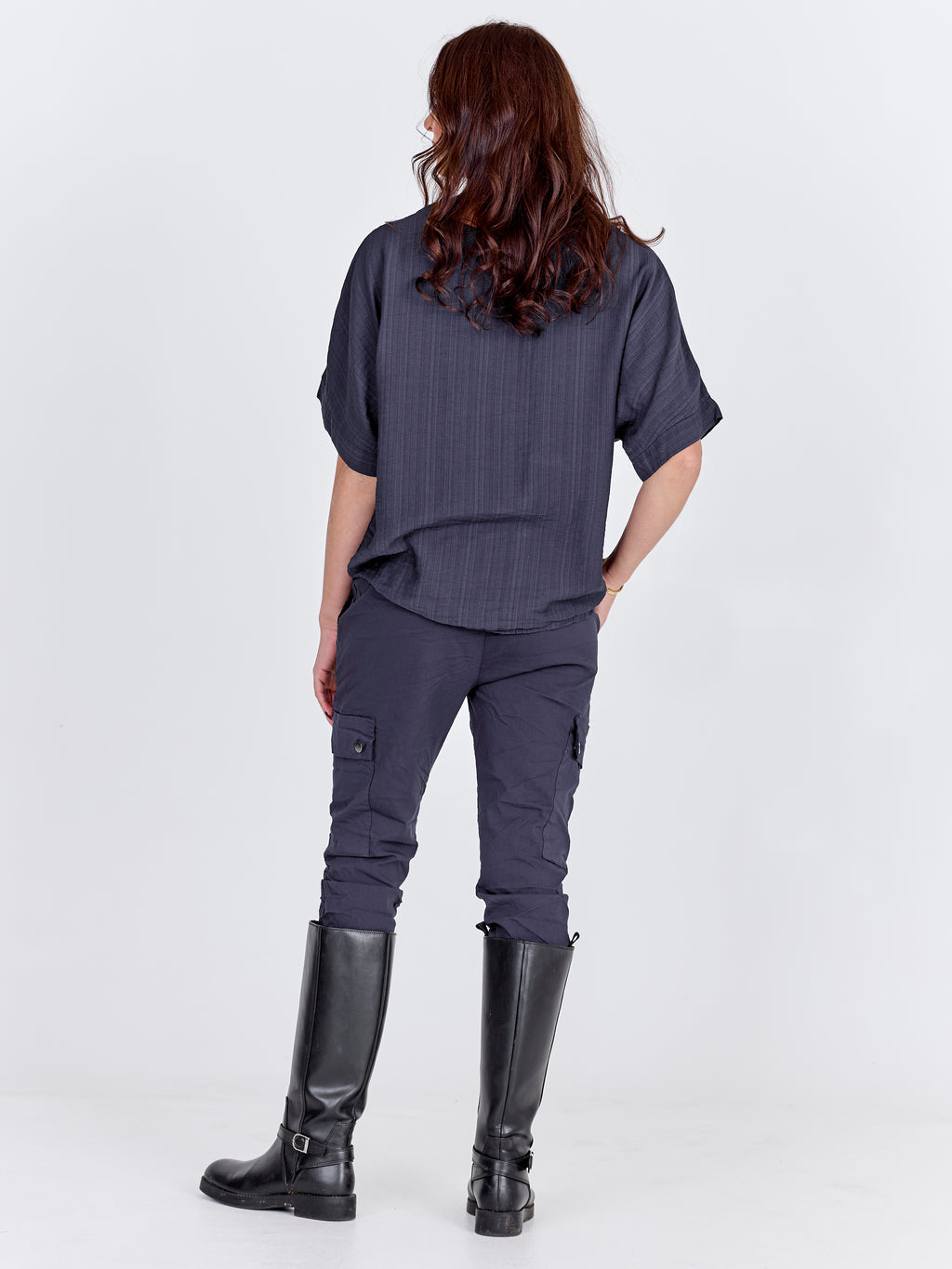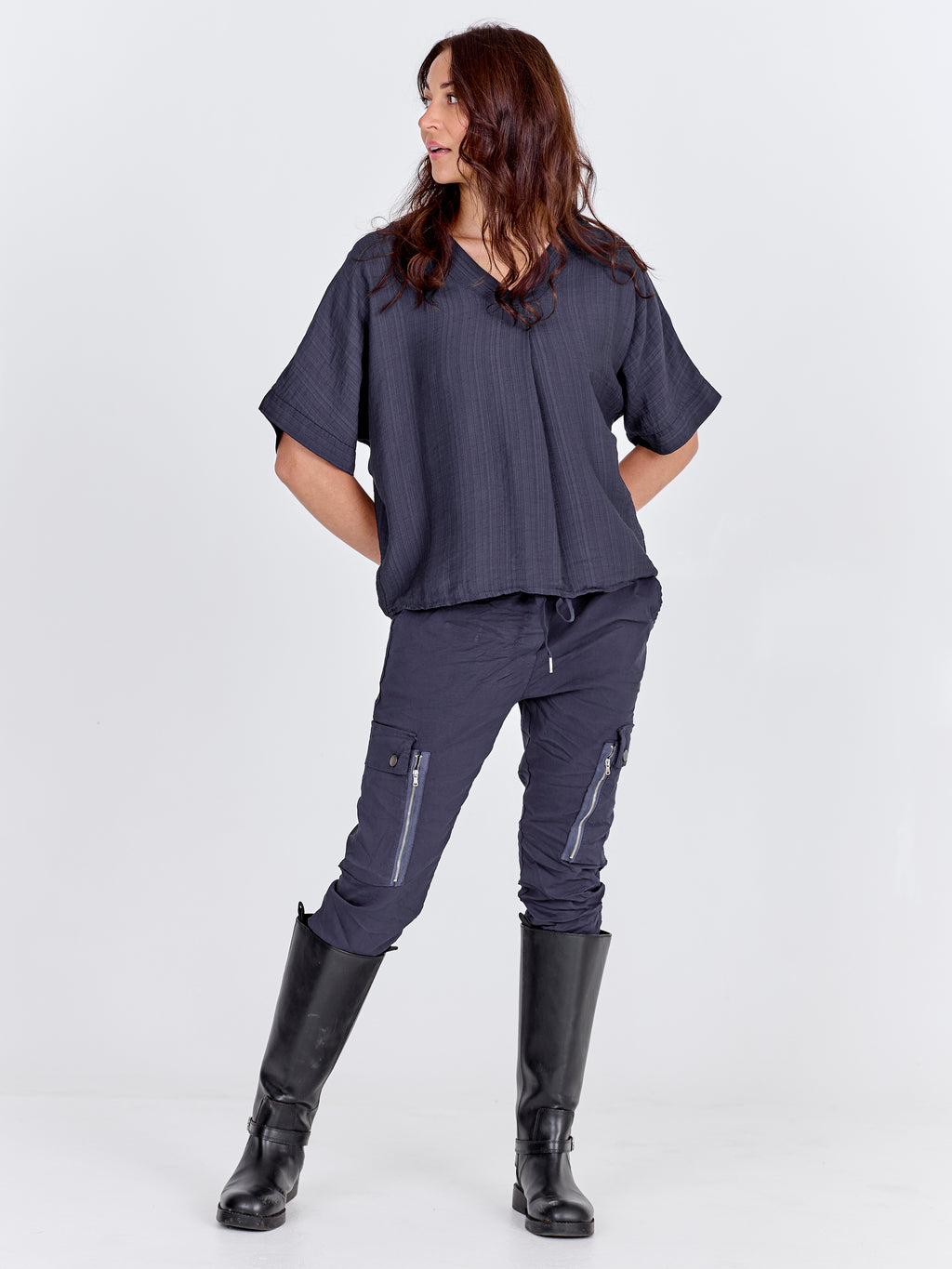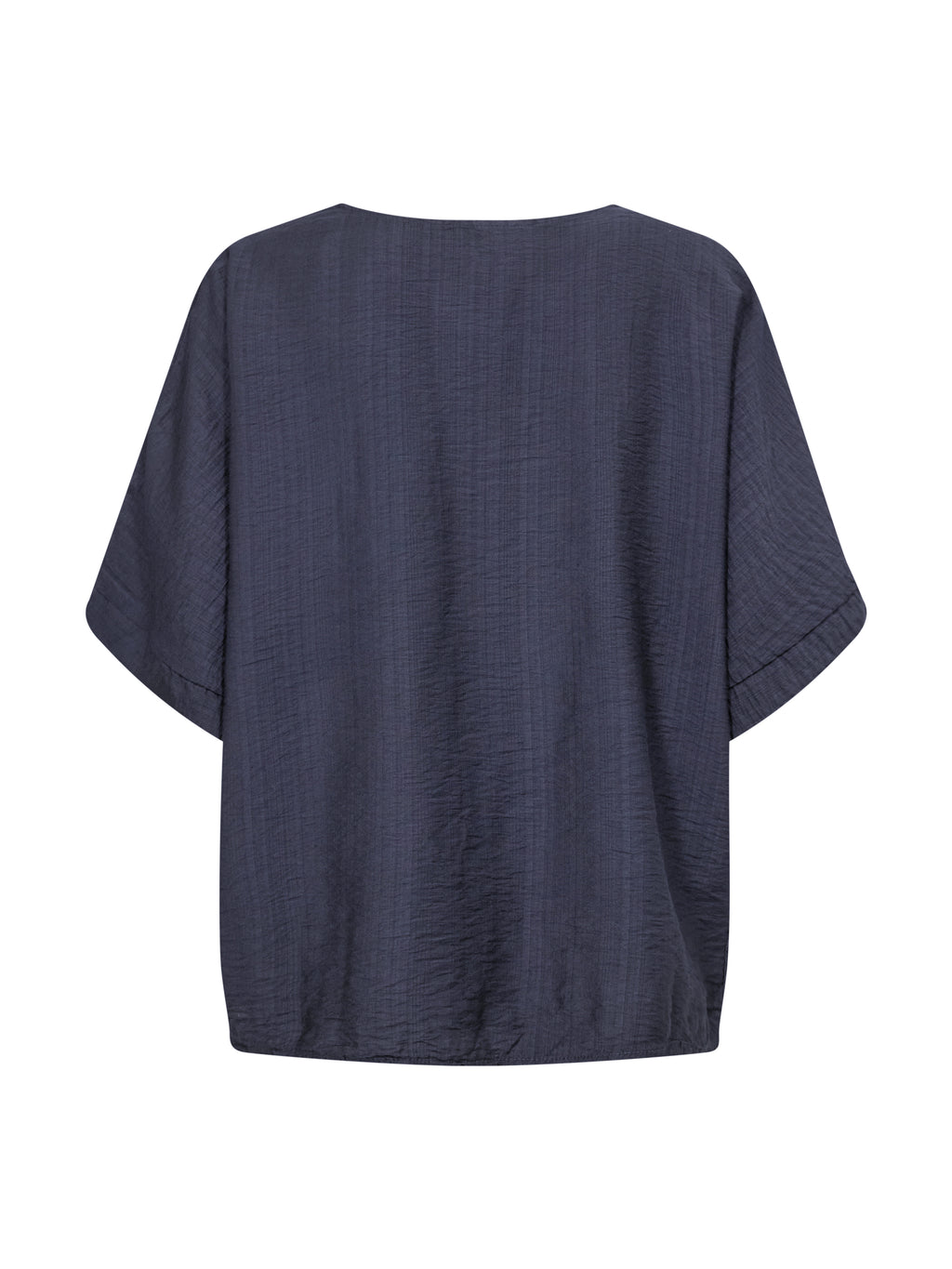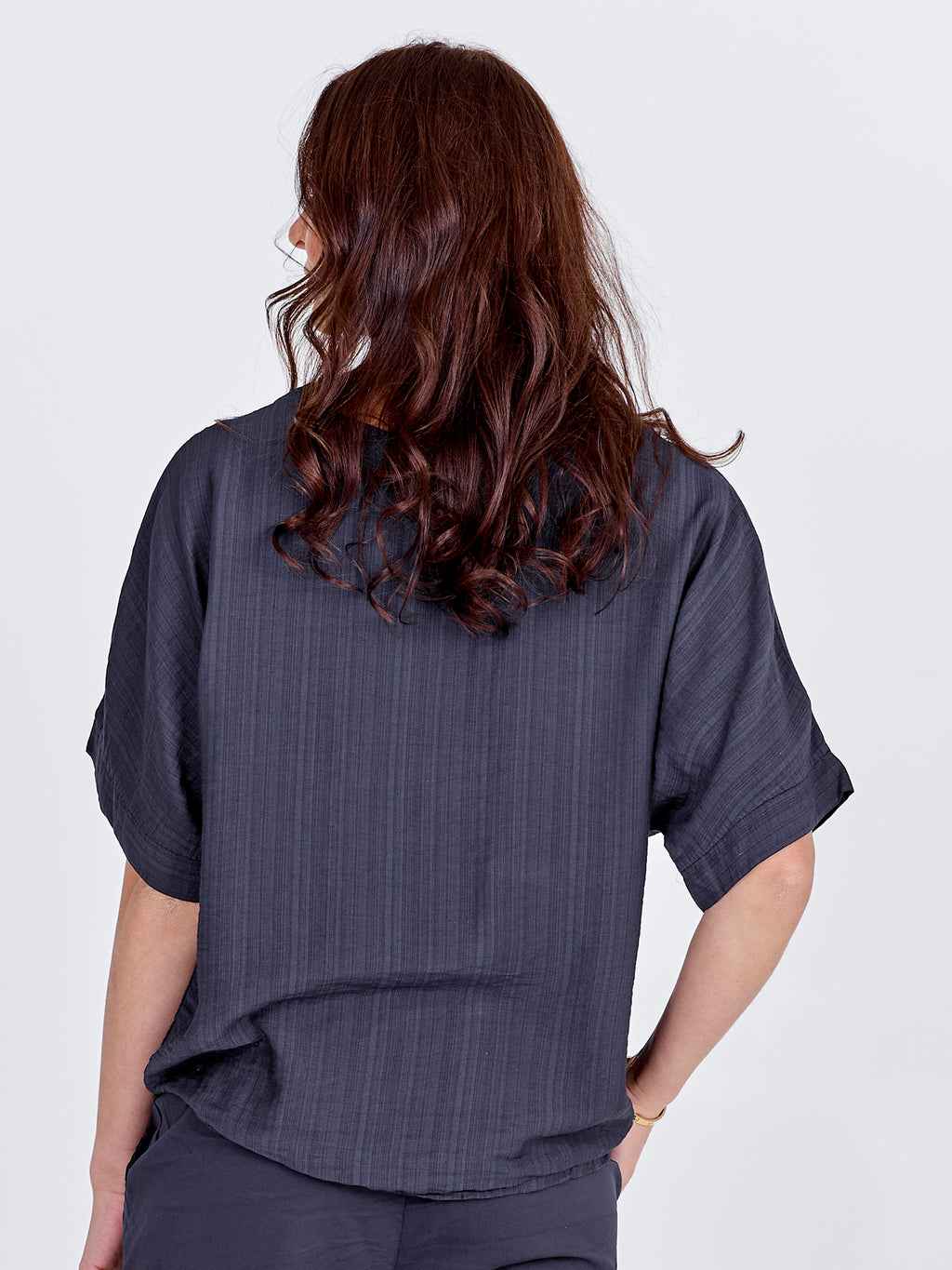 Deze luchtige blouse combineert comfort en eenvoud met zijn licht gestructureerde materiaal en relaxte pasvorm. Het heeft korte, loszittende mouwen en een V-halslijn met een decoratieve plooi aan de voorkant, wat een zacht middelpunt aan het ontwerp toevoegt. De wijde mouwboord geeft de blouse een subtiele lift en maakt de relaxte look compleet.