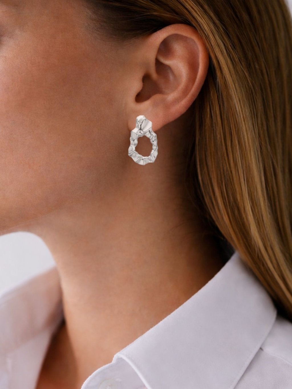 Deze oorbel heeft een organische en artistieke expressie, gevormd met zachte, onregelmatige lijnen die een levendige en sculpturale uitstraling creëren. De open silhouet geeft een lichte en moderne touch, waardoor het sieraad gemakkelijk te stylen is voor zowel dagelijks gebruik als feestelijke gelegenheden. Een opvallend detail dat karakter toevoegt aan elke outfit - of het nu alleen gedragen wordt of samen met andere oorbellen.