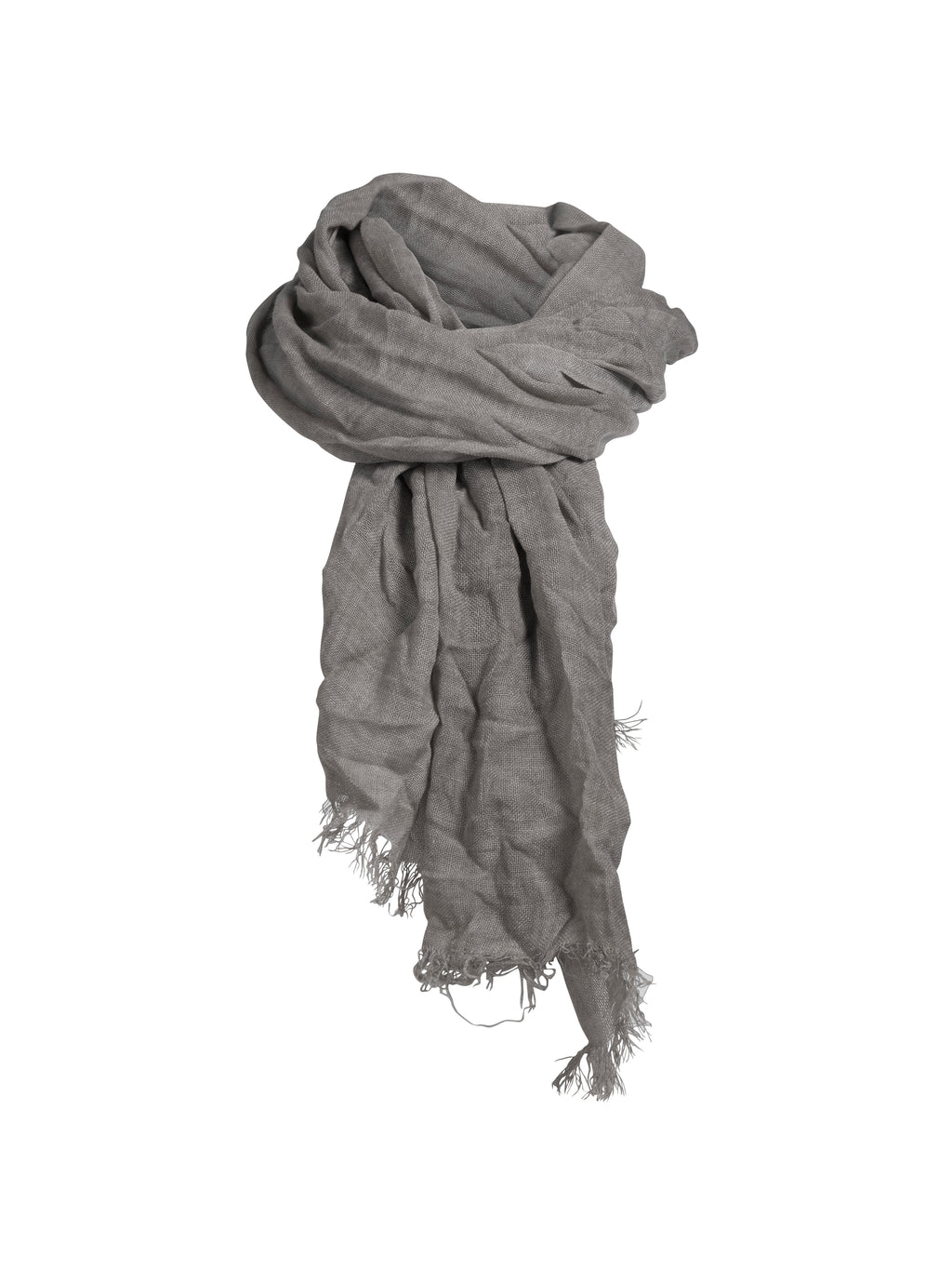Deze sjaal is gemaakt van een licht en luchtig materiaal met een zachte structuur die natuurlijk om de nek en schouders valt. Het heeft een ietwat gekreukeld uiterlijk en is afgewerkt met korte franjes, wat een rauw randje toevoegt aan het eenvoudige ontwerp.