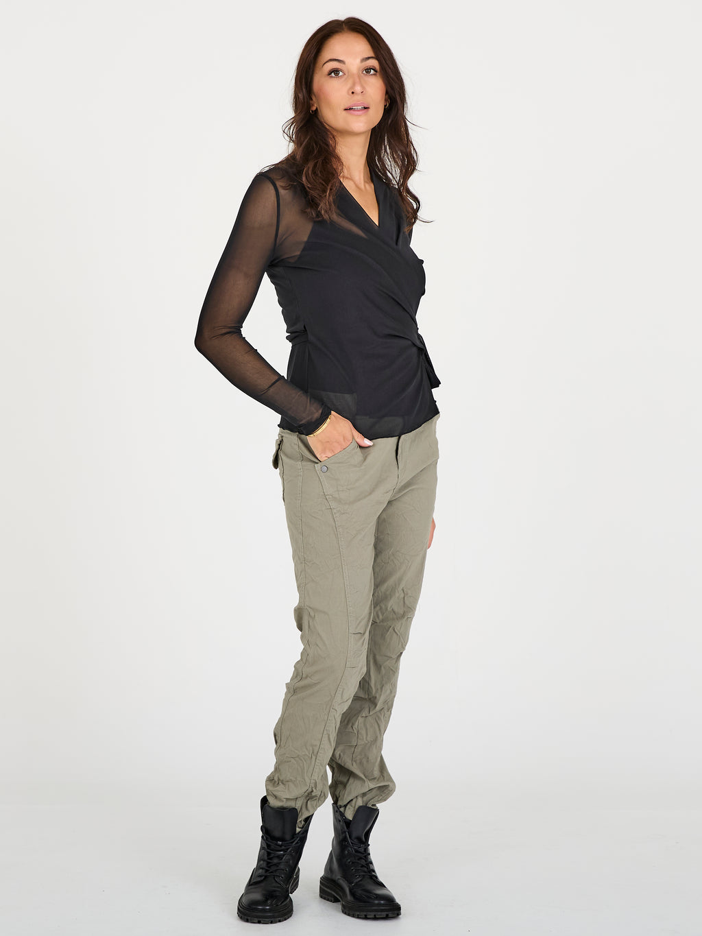 Het model is 180 cm lang en draagt maat S.