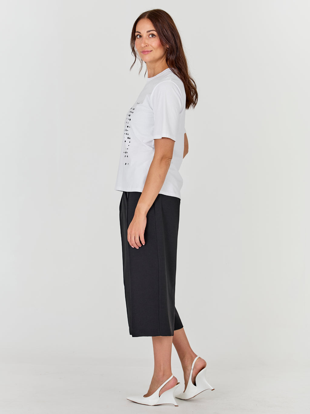 Style het T-shirt met een open overhemd en een paar jeans voor een ontspannen, maar goed geklede uitstraling, of draag het onder een blazer voor een meer gepolijste alledaagse outfit.