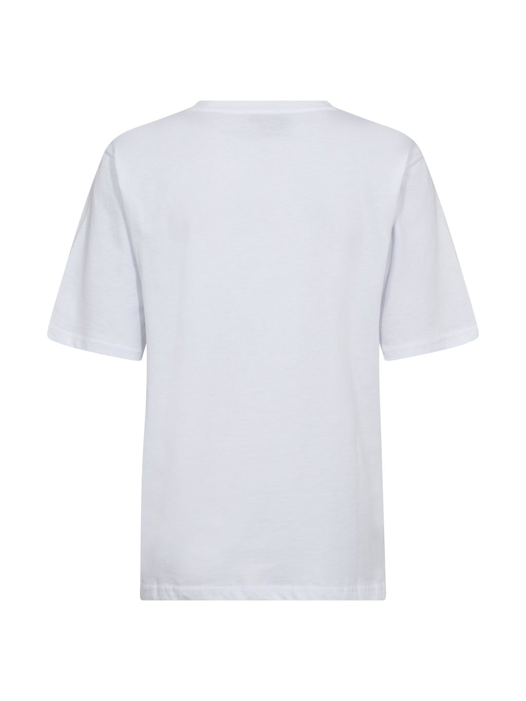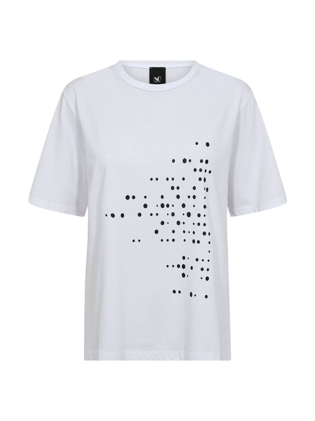 Een eenvoudig en modern T-shirt met korte mouwen en een klassieke ronde hals. De voorkant is versierd met een grafische print, waardoor het een stijlvolle uitstraling heeft, terwijl de achterkant eenvoudig en effen wordt gehouden voor een rustig contrast. De pasvorm is iets los, wat zorgt voor een hoog comfort en bewegingsvrijheid.