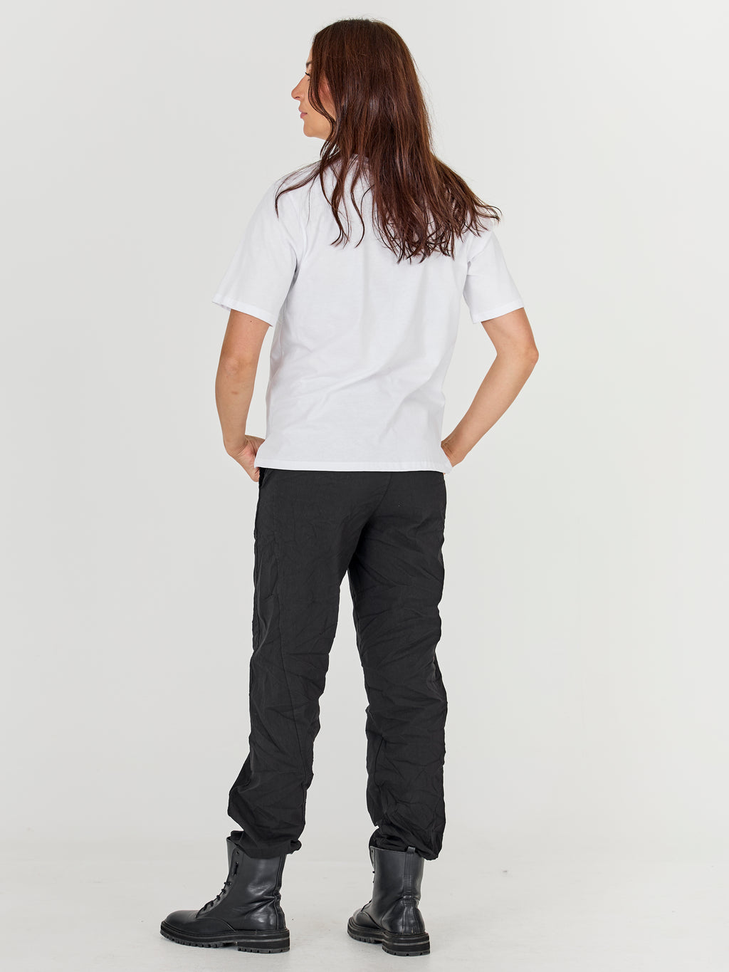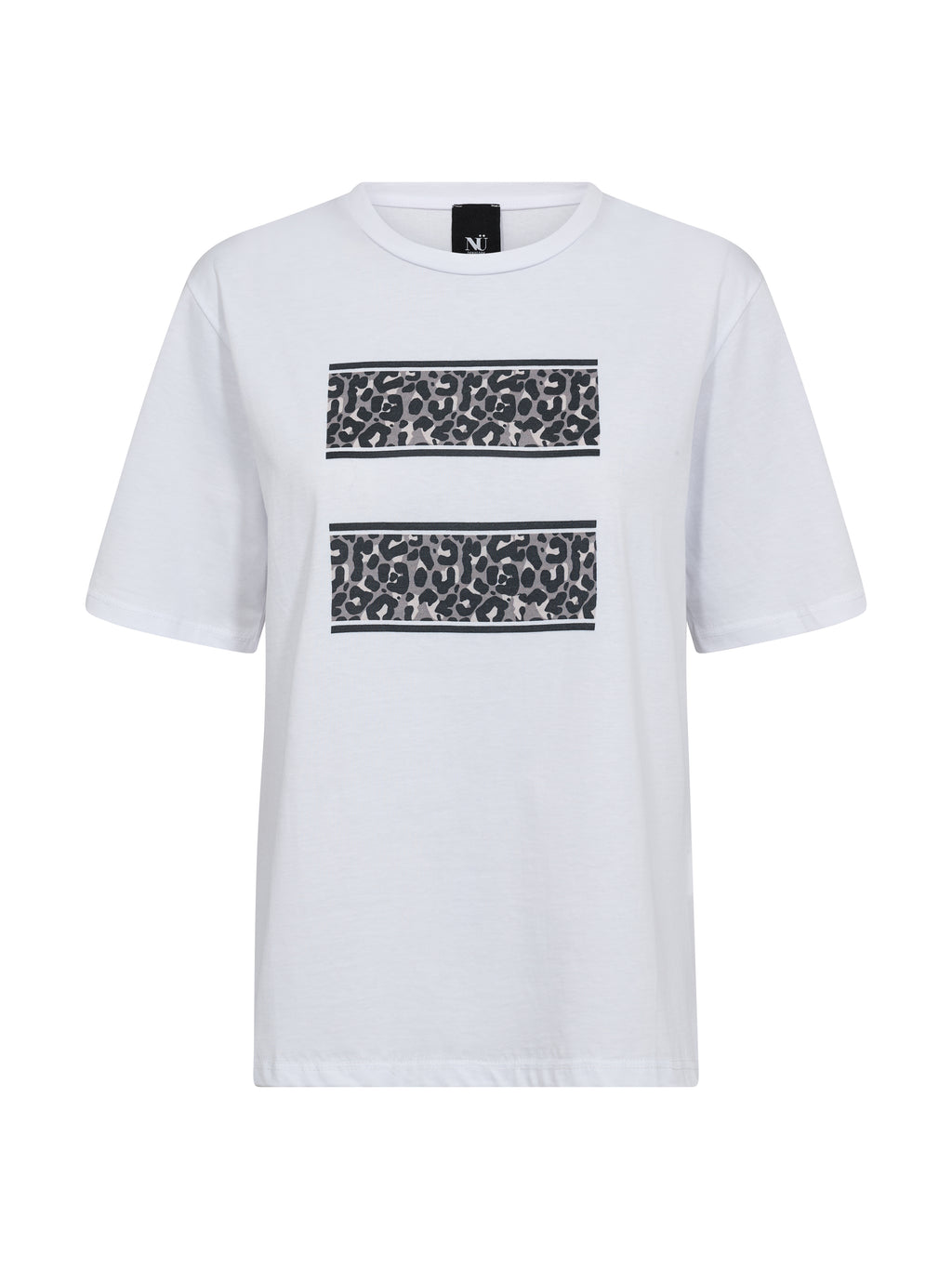 Een eenvoudig en modern T-shirt met korte mouwen en een klassieke ronde hals. De voorkant is versierd met een grafische print, waardoor het een stijlvolle uitstraling heeft, terwijl de achterkant eenvoudig en effen wordt gehouden voor een rustig contrast. De pasvorm is iets los, wat zorgt voor een hoog comfort en bewegingsvrijheid.
