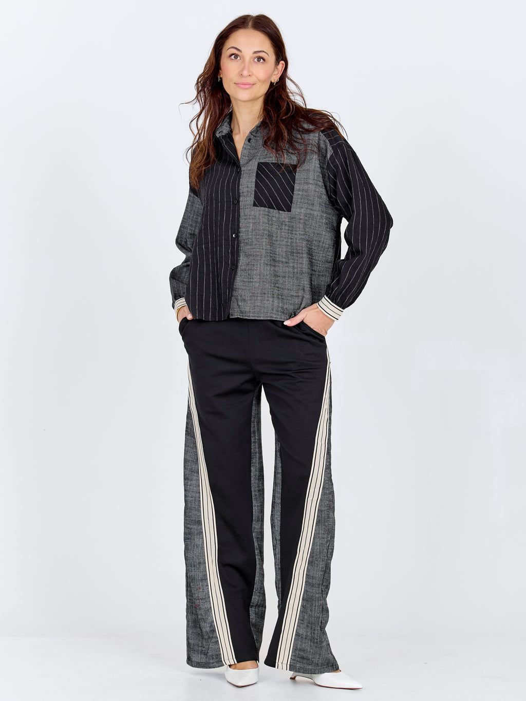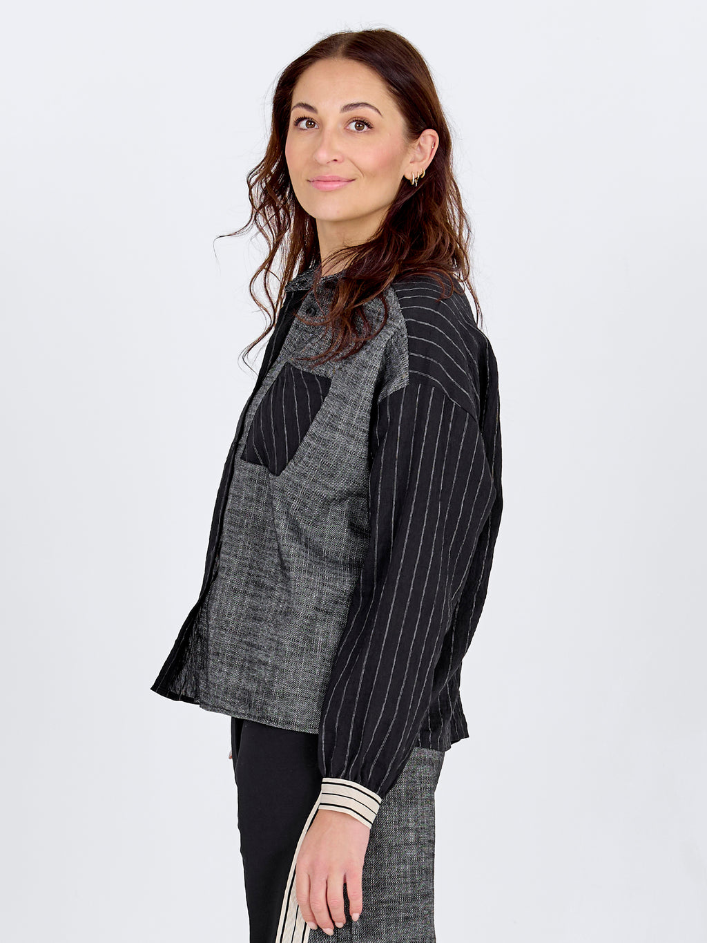 Dit overhemd combineert verschillende structuren en strepen in een modern patchworkontwerp. Het heeft korte mouwen, een klassieke kraag en een doorlopende knoopsluiting. Op de borst is een enkele zak te zien met verticale strepen die in contrast staan met het asymmetrische patroon van de voorkant. Het achterpand zet de gestreepte look voort en zorgt voor een harmonieuze afwerking.
