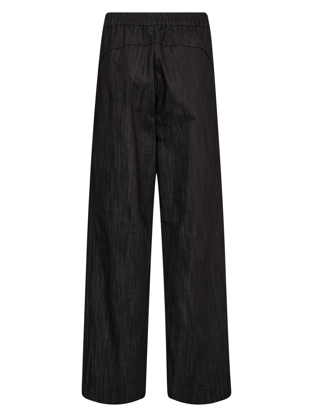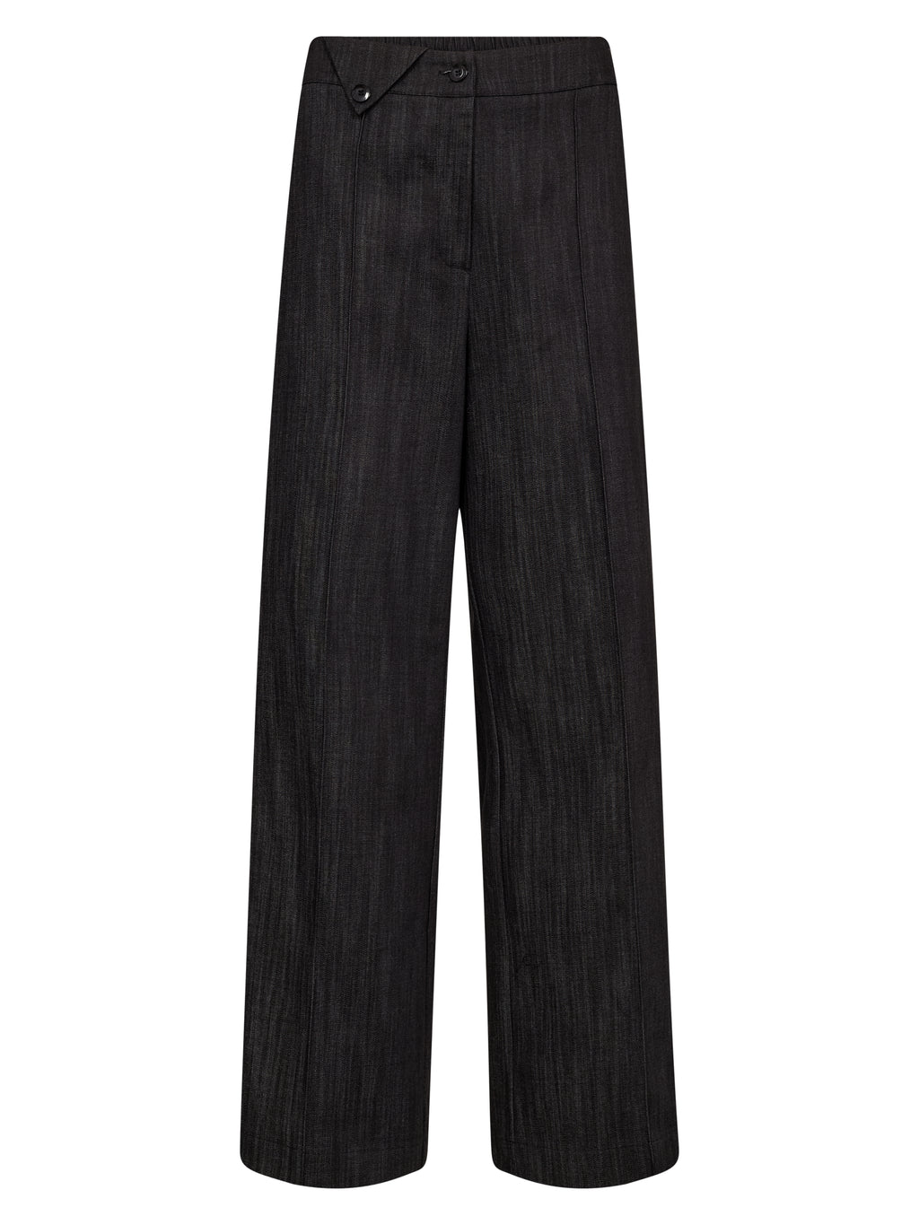 Deze broek heeft een klassieke, schone uitstraling met brede, rechte pijpen en een gladde, structuurgeweven kwaliteit die mooi om de benen valt. De taille sluit met een knoop en ritssluiting, en het ontwerp is eenvoudig en veelzijdig - perfect voor zowel casual als meer formele looks.