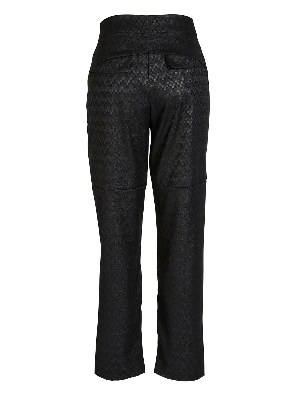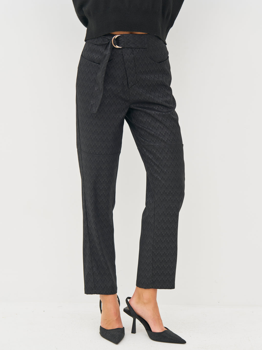 De broek heeft een discreet maar opvallend patroon, waardoor de stof een exclusieve uitstraling krijgt. De rechte pijpen en de stevige tailleband creëren een elegante silhouet, terwijl de riem met D-ring een stijlvol element toevoegt en zorgt voor een verstelbare pasvorm. De voorzakken zijn functioneel en de paspelzakken aan de achterkant completeren het verfijnde ontwerp. Kniestiknaden zorgen voor extra structuur.