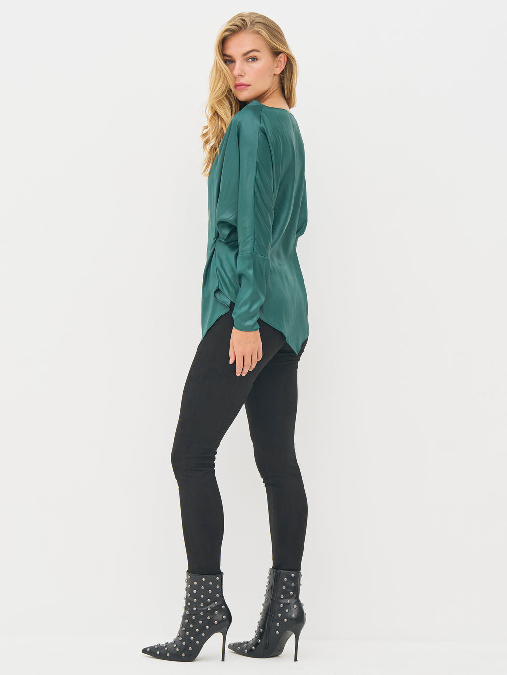 Voeg een moderne twist toe aan de garderobe met deze zachte, glanzende blouse. Het heeft een losse pasvorm en een speciale puntige rok die een flatterende en opvallende silhouet creëert. De mouwen zijn lang met een wijde manchet en lichte ruches, wat extra karakter toevoegt aan het eenvoudige ontwerp.