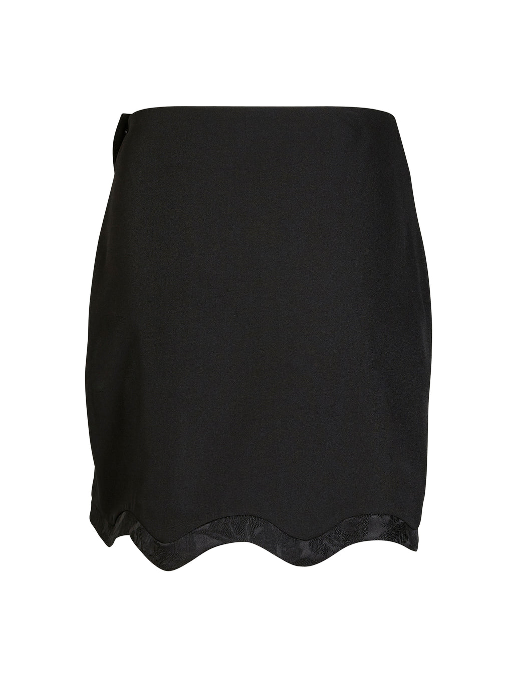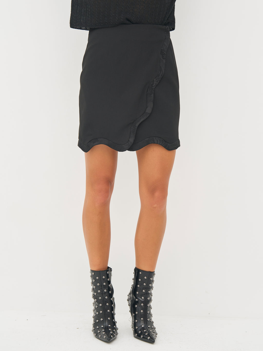 Deze elegante rok heeft een eenvoudige en vrouwelijke uitdrukking met zijn wikkelontwerp en golvende rand. Het sluit discreet met knopen aan de linkerkant, wat ook een decoratief detail toevoegt. Een glanzende rand met lichte textuur benadrukt de silhouet en geeft de rok een verfijnde touch.