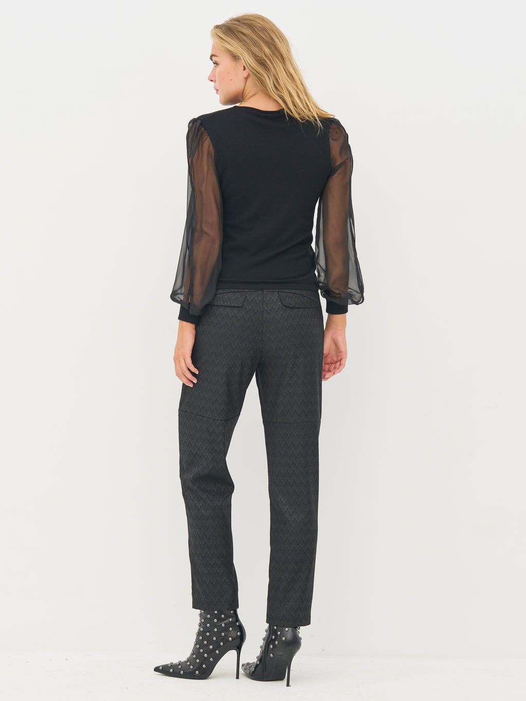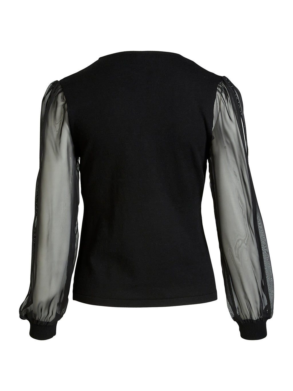 Voeg een vrouwelijke en verfijnde touch toe aan je garderobe met deze gebreide blouse. Het heeft een flatteus wikkel effect aan de voorkant en zachte, transparante ballonmouwen die een delicaat contrast creëren met de strak geweven breikwaliteit van het lichaam. De geribbelde manchetten maken het ontwerp compleet en zorgen voor een goede pasvorm.