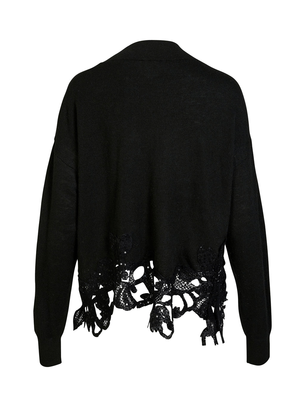 Geef je outfit een exclusieve touch met deze gebreide poncho met decoratieve kanten rand. Het heeft een losse pasvorm en een ronde hals, terwijl het opvallende kant onderaan een vrouwelijke en feestelijke uitstraling toevoegt. Het licht transparante kanten paneel is versierd met kleine pailletten die het licht vangen en een subtiele glans creëren.
