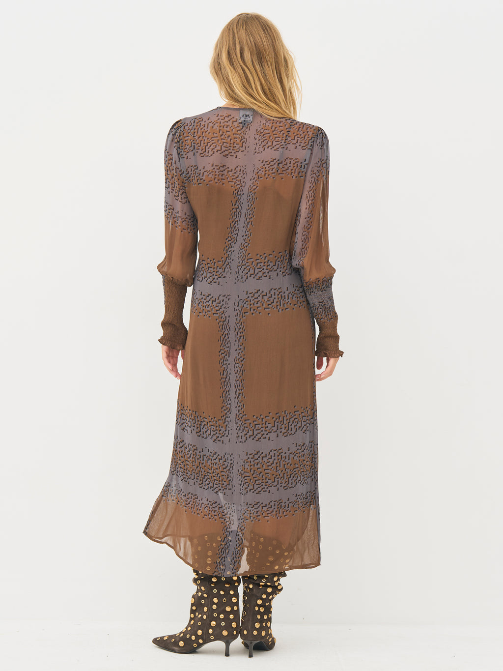Deze jurk combineert lichtheid en structuur met zijn delicate, transparante materiaal en grafisch patroon. Het heeft een omslageffect met een strik in de taille en lange mouwen met smokwerk en delicate ruches, wat een vrouwelijk detail toevoegt. De meegeleverde voering zorgt voor comfortabele bedekking.