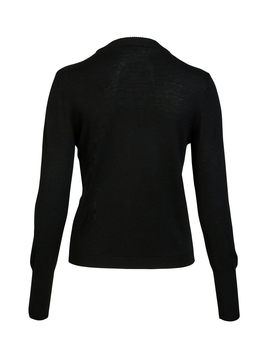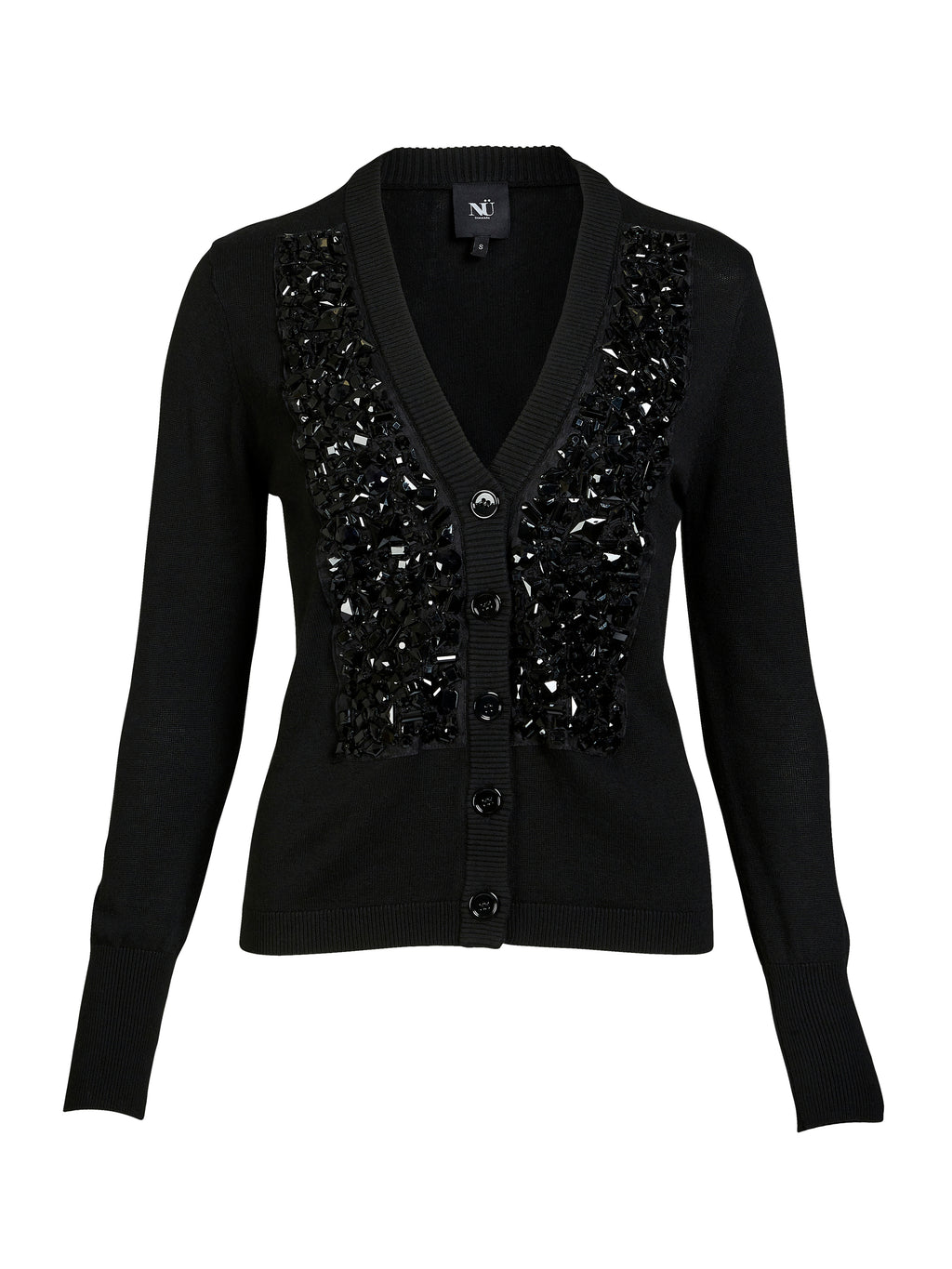 Deze gebreide cardigan combineert een klassieke pasvorm met feestelijke details. Het heeft een diepe V-hals, geribbelde afwerkingen en knopen voor sluiting aan de voorkant. De voorkant is versierd met glanzende studs en stenen in verschillende vormen, waardoor het een exclusieve en opvallende uitstraling heeft.