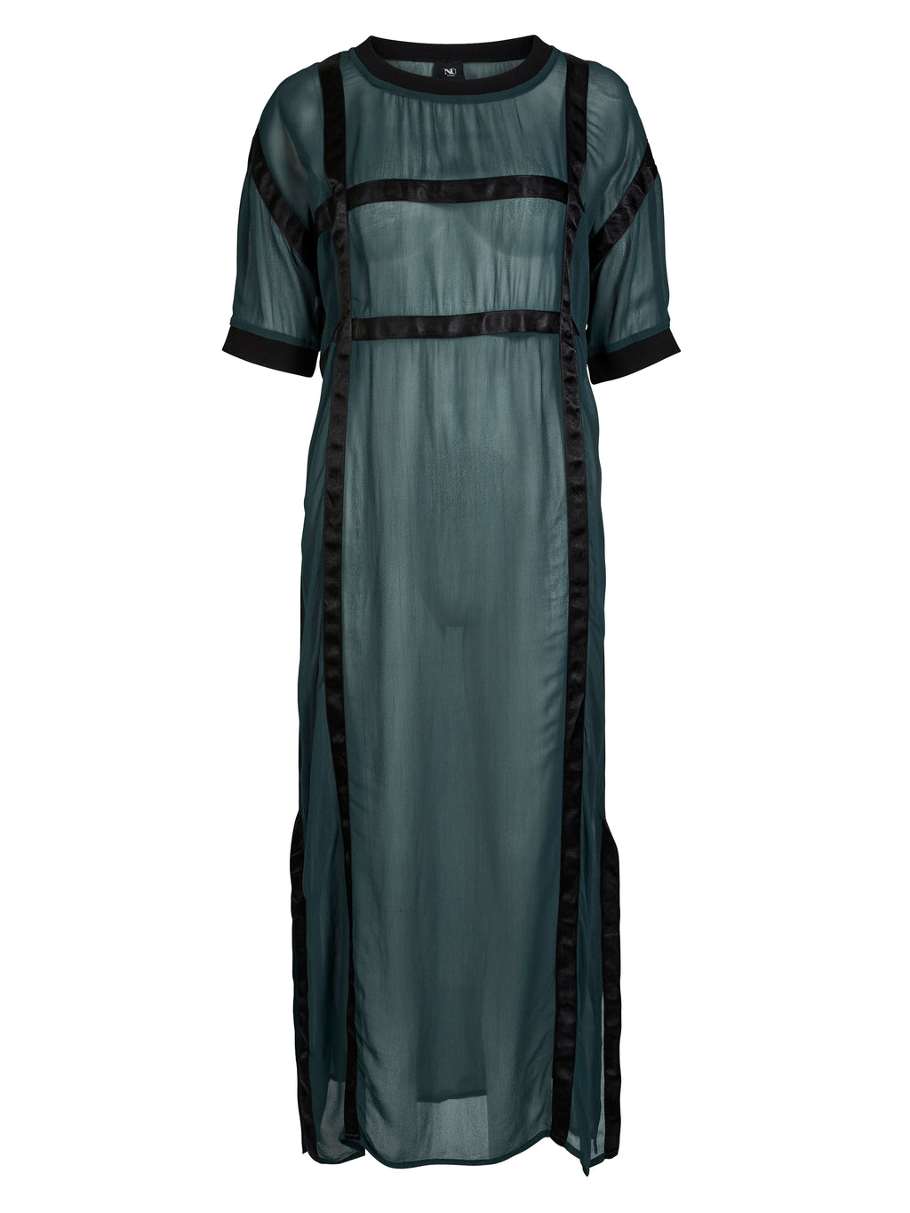Deze jurk springt eruit met zijn moderne en grafische uitdrukking. Het is gemaakt van een lichtgewicht transparant materiaal en heeft korte mouwen en een ronde hals. De zwarte banden langs het lichaam en de mouwen creëren een gestructureerd contrast en geven de jurk een stoere en verfijnde uitstraling.