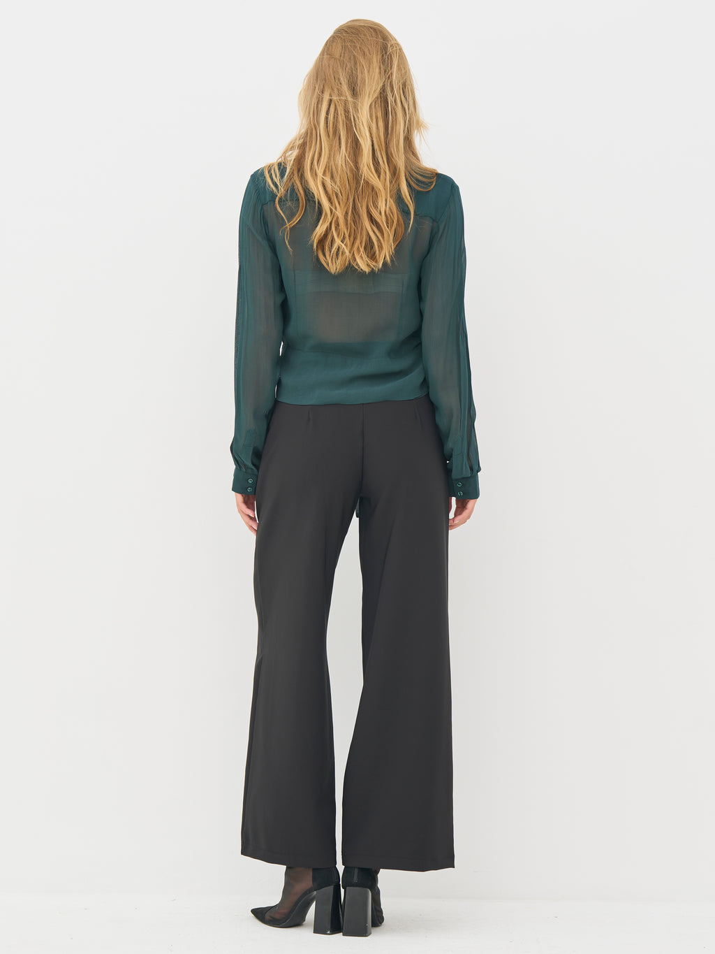 Creëer een lichte en vrouwelijke look met deze blouse van transparant materiaal. Het heeft een klassieke kraag, sluiting met knoopjes aan de voorkant, en lange mouwen met manchetten. De blouse bindt aan de taille voor een flatterend silhouet en een relaxte maar goed geklede uitstraling.