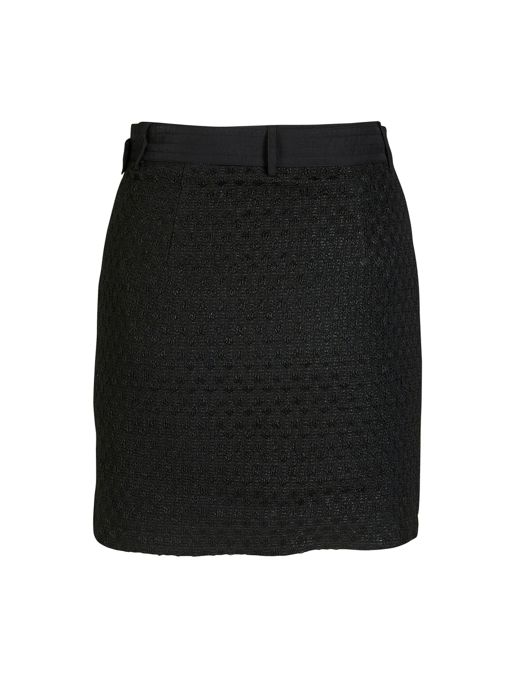 Creëer een elegante en moderne uitdrukking met deze gestructureerde rok in exclusief geweven materiaal. Het heeft een asymmetrische voorkant met decoratieve knopen en een onderscheidend randdetail dat een verfijnde twist toevoegt. De taille wordt geaccentueerd met riemlussen en een bijbehorende riem, wat zorgt voor een mooie pasvorm en de silhouet benadrukt.