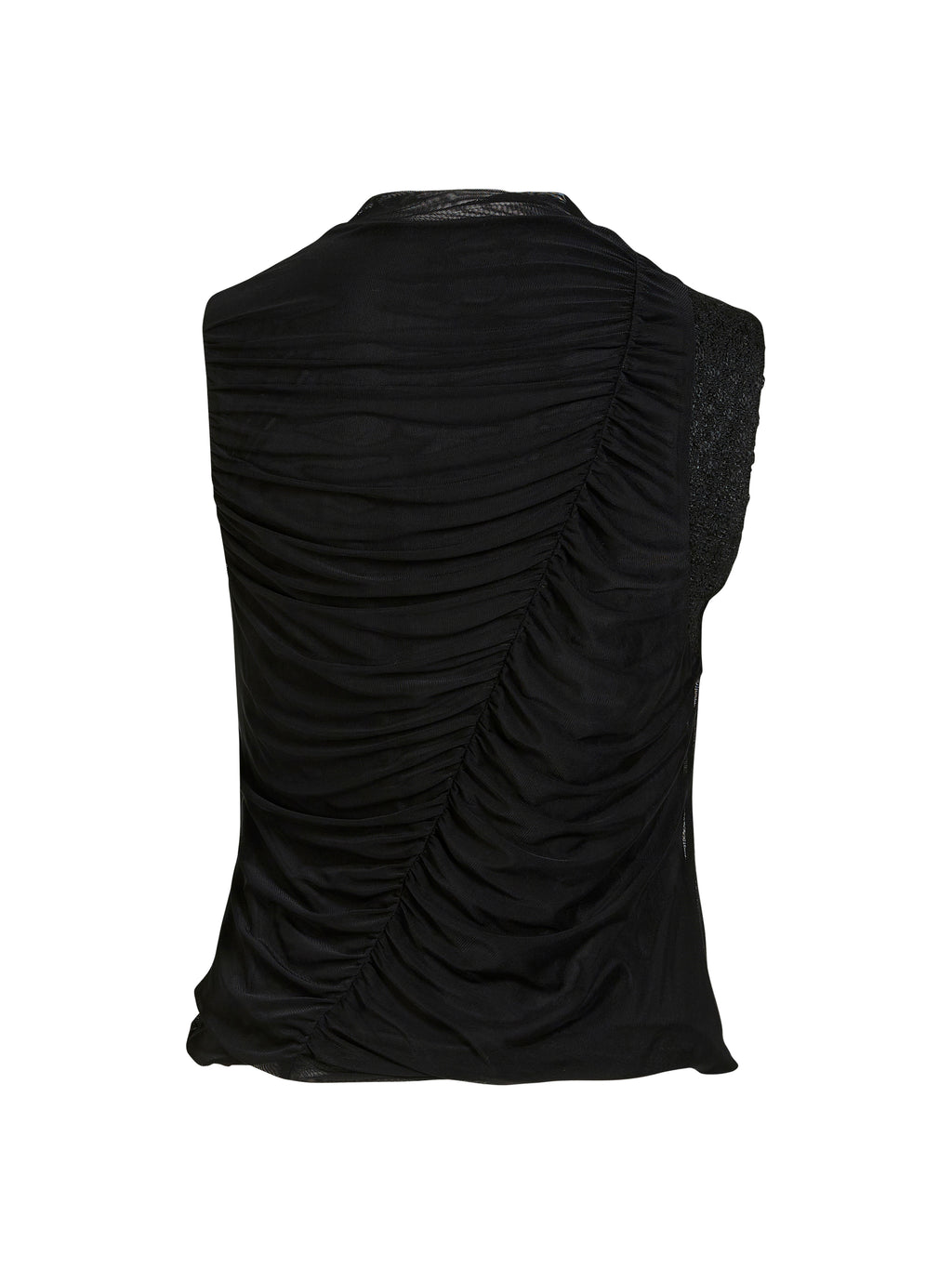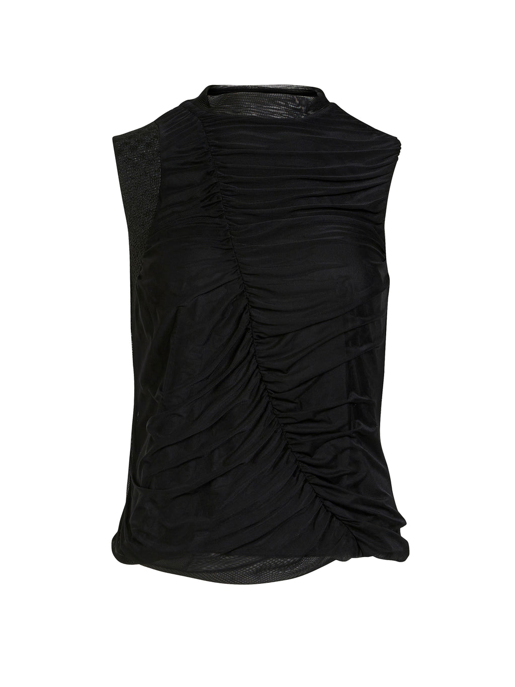 Een moderne twist aan de klassieke top - dit mouwloze model valt op door zijn gedurfde, diagonale gerimpelde ontwerp zowel aan de voorkant als aan de achterkant. Een glanzend detail bij de hals voegt karakter toe, terwijl de licht doorschijnende mesh-structuur een verfijnde uitstraling geeft. De aansluitende silhouet maakt het ideaal onder een blazer of op zichzelf als een statementstuk.