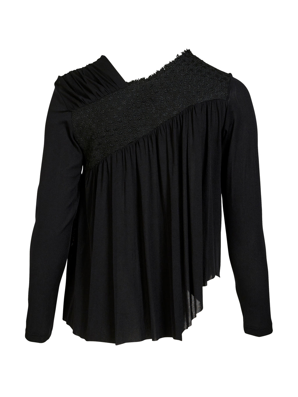 Deze blouse valt op met zijn asymmetrische rits en opwindende combinatie van texturen. Het bovenste deel is gemaakt van een gestructureerde stof, wat een contrast creëert met de lichte, geplooide val aan de onderkant. De lange mouwen en zachte kwaliteit zorgen voor comfort, terwijl de schuine snit een extra dimensie en beweging toevoegt.