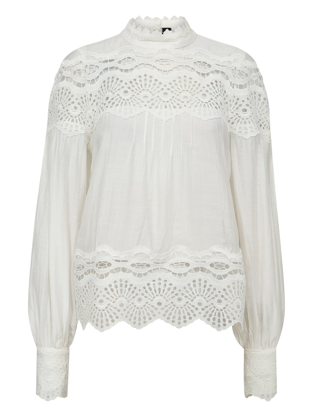 Creëer een verfijnde en romantische uitstraling met deze prachtige shirt die klassieke snitten combineert met decoratieve kanten details. De brede kanten linten versieren zowel de borst, rug, manchetten en zoom, waardoor een elegant samenspel ontstaat tussen transparantie en dichtheid. De kleine opstaande kraag en knoopsluiting aan de achterkant voegen een stijlvolle afwerking toe.
