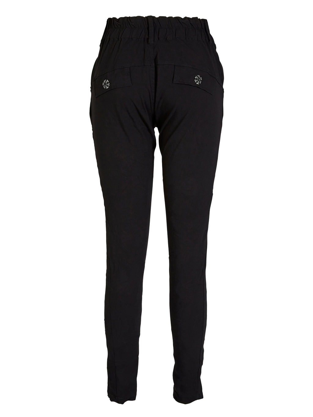 Deze broek heeft een slanke pasvorm en decoratieve details, wat zorgt voor een elegante en moderne uitstraling. De off-center voorste knopen met sprankelende stenen creëren een opvallend element, terwijl het elastiek aan de achterkant zorgt voor een comfortabele pasvorm. De schuine naden en insteek achterzakken maken het stijlvolle ontwerp compleet.