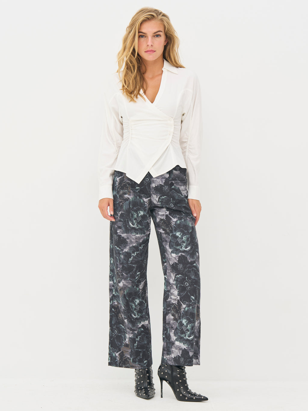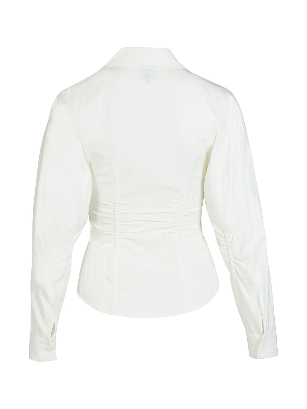 Benadruk je taille met deze elegante blouse met een wikkel effect en een getailleerde pasvorm. De fijne geplooide details aan de zijkanten en mouwen voegen beweging en structuur toe, terwijl het puntige voorstuk een verfijnde silhouet creëert. De kraag en knoopsluiting benadrukken de klassieke look met een moderne twist.