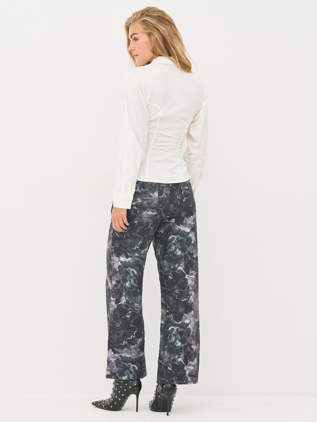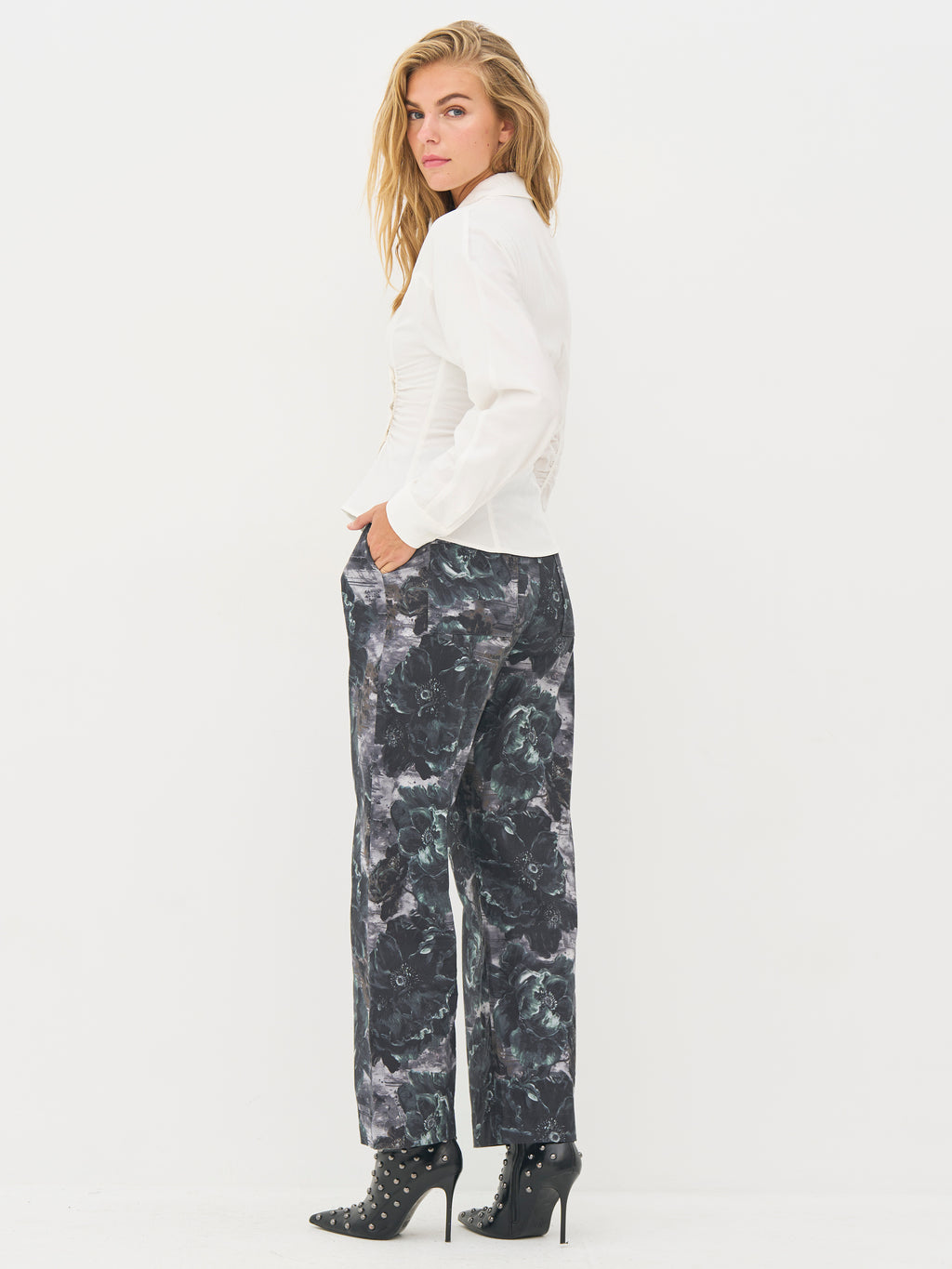 Style de blouse met aansluitende broek en een clutch voor een strakke look voor feestelijke gelegenheden.