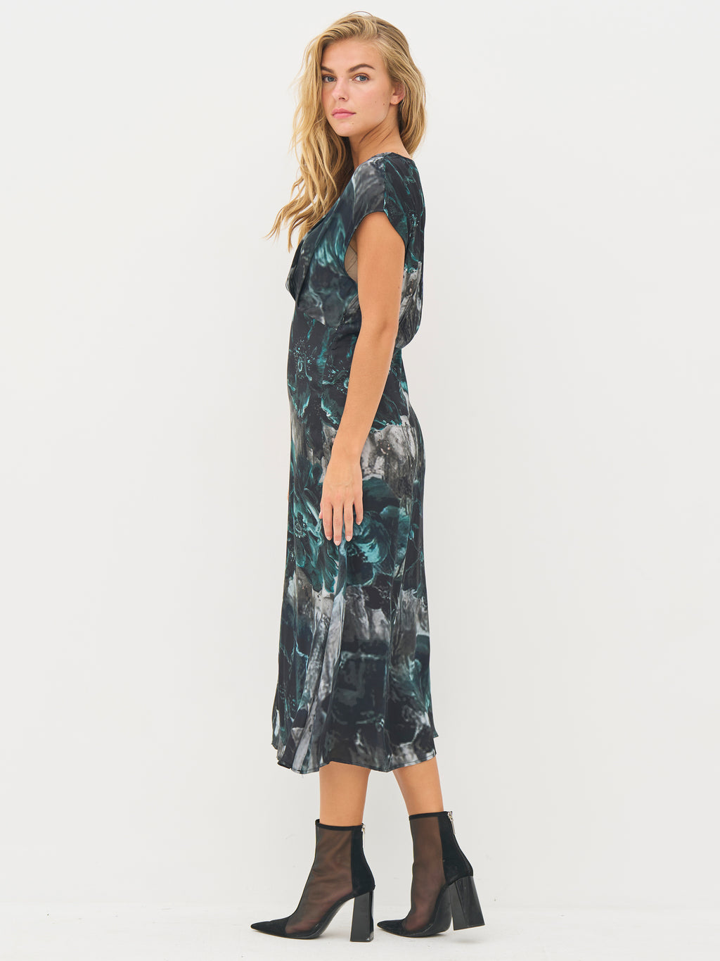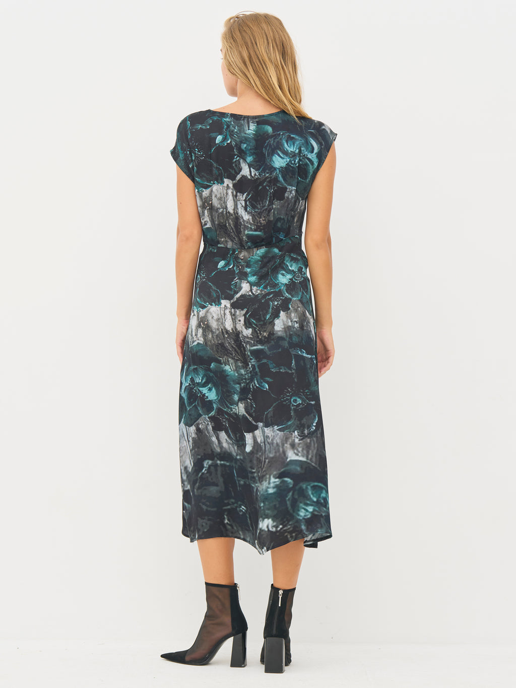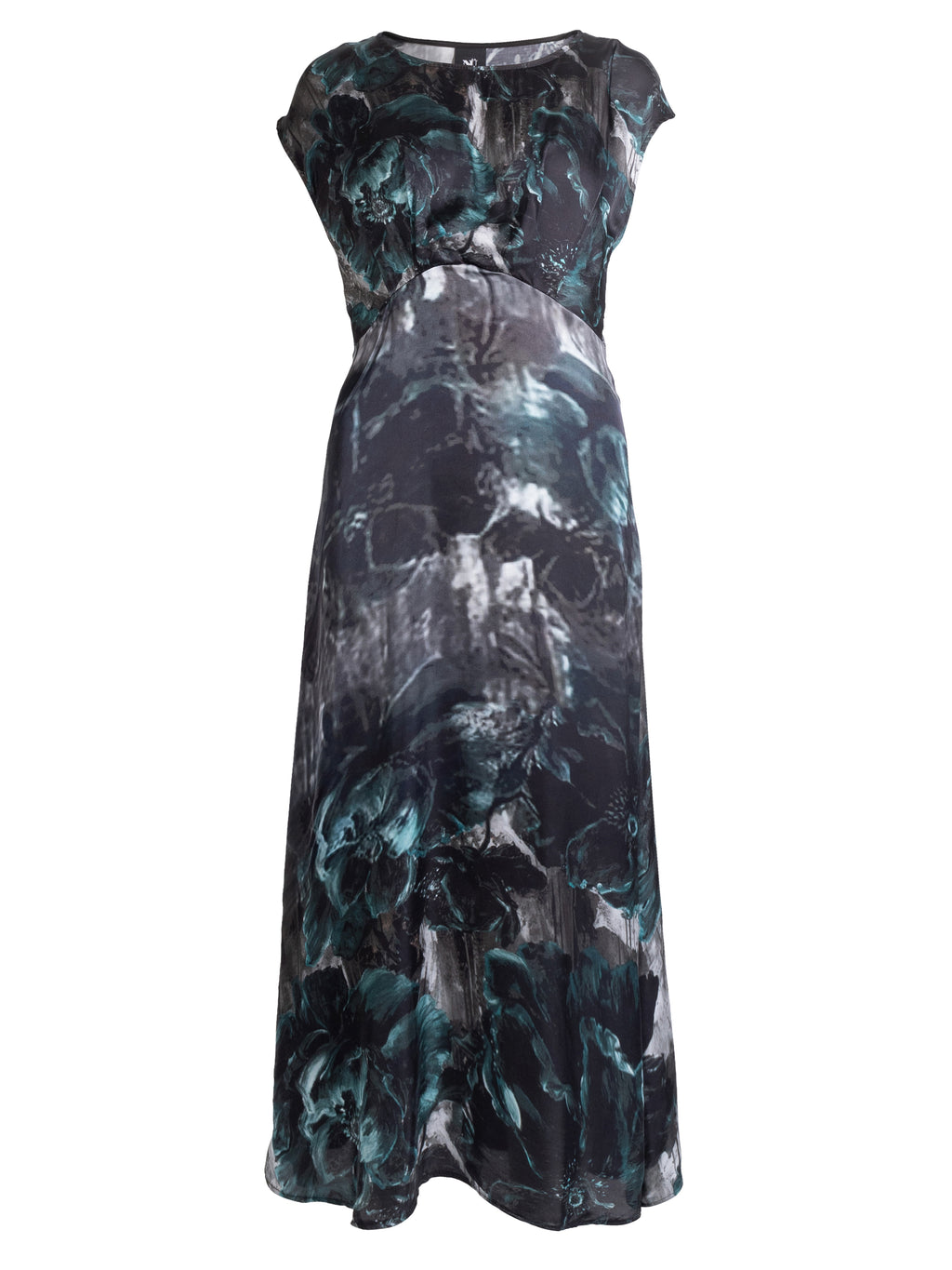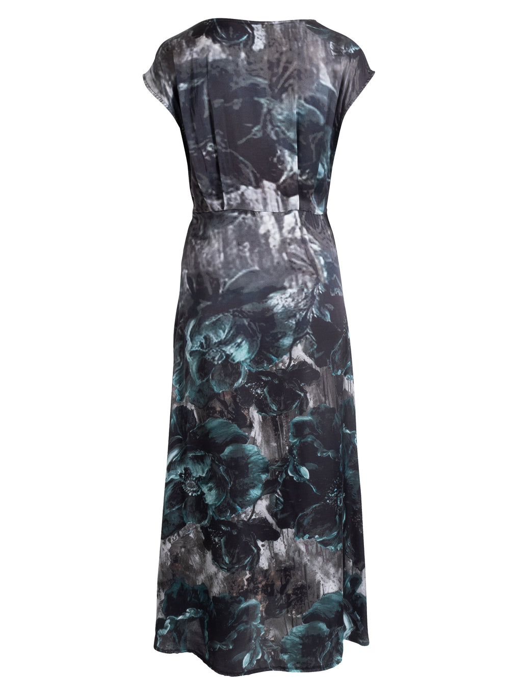 Een elegante keuze voor zowel dagelijks gebruik als feestelijke gelegenheden. Deze lange jurk heeft een mooie val en een vrouwelijke snit met een licht gedefinieerde taille. De zachte stof volgt het lichaam op een flatterende manier, terwijl de opvallende bloemenprint diepte en karakter toevoegt aan het ontwerp. De korte mouwen en ronde hals bieden een eenvoudige en tijdloze uitstraling.