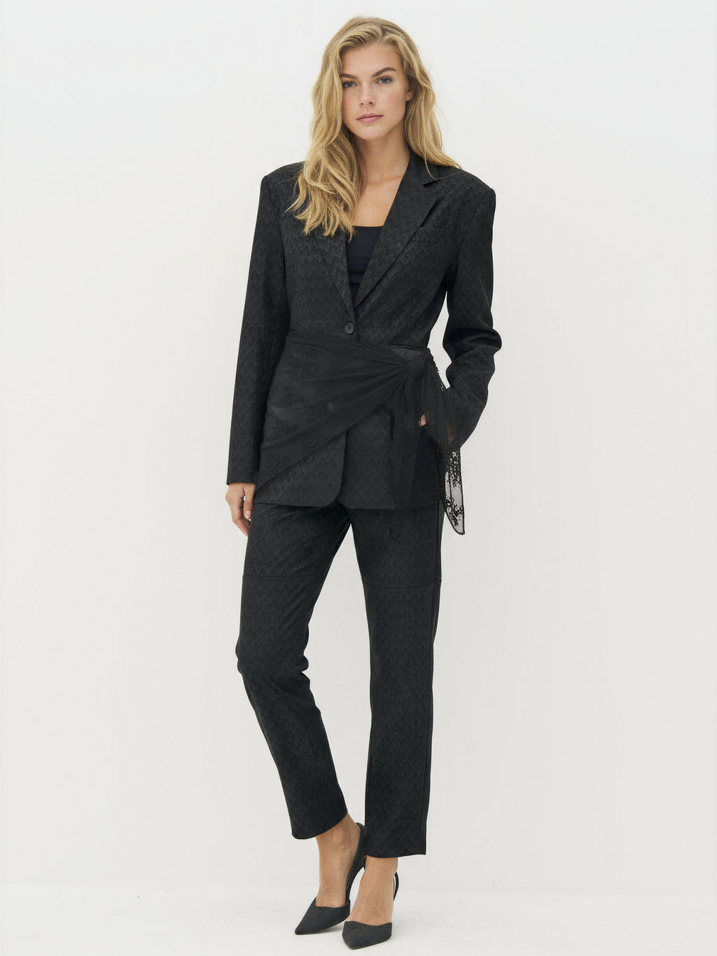 Een licht en decoratieve sjaal in transparant gaas met geborduurd kantpatroon. De driehoekige vorm en zachte kwaliteit maken het gemakkelijk om op verschillende manieren te stylen - bind het om de taille als een riem, gebruik het in het haar of over de schouders. Een elegant en decoratief accessoire dat een vrouwelijke en persoonlijke touch toevoegt aan je outfit.