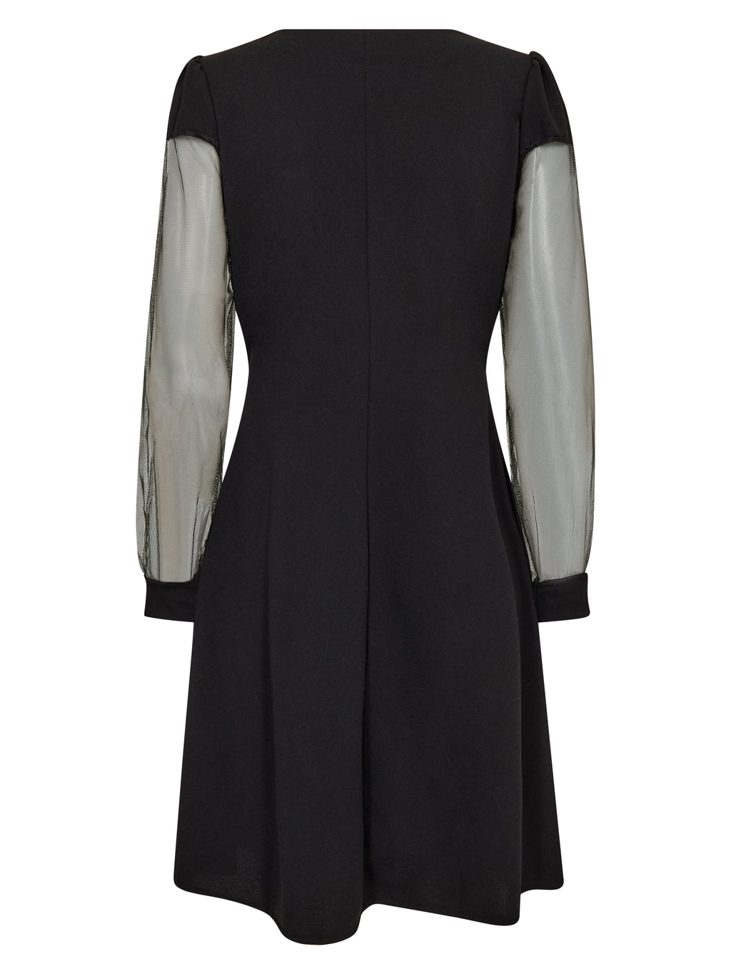 De jurk heeft een elegante V-hals met zachte plooien aan de voorkant, wat een vrouwelijke uitstraling geeft. De mouwen zijn gemaakt van licht, transparant gaas en eindigen met vaste manchetten, die een mooie tegenstelling vormen met het eenvoudige ontwerp. De rok heeft een lichte A-lijn en valt zacht om het lichaam.